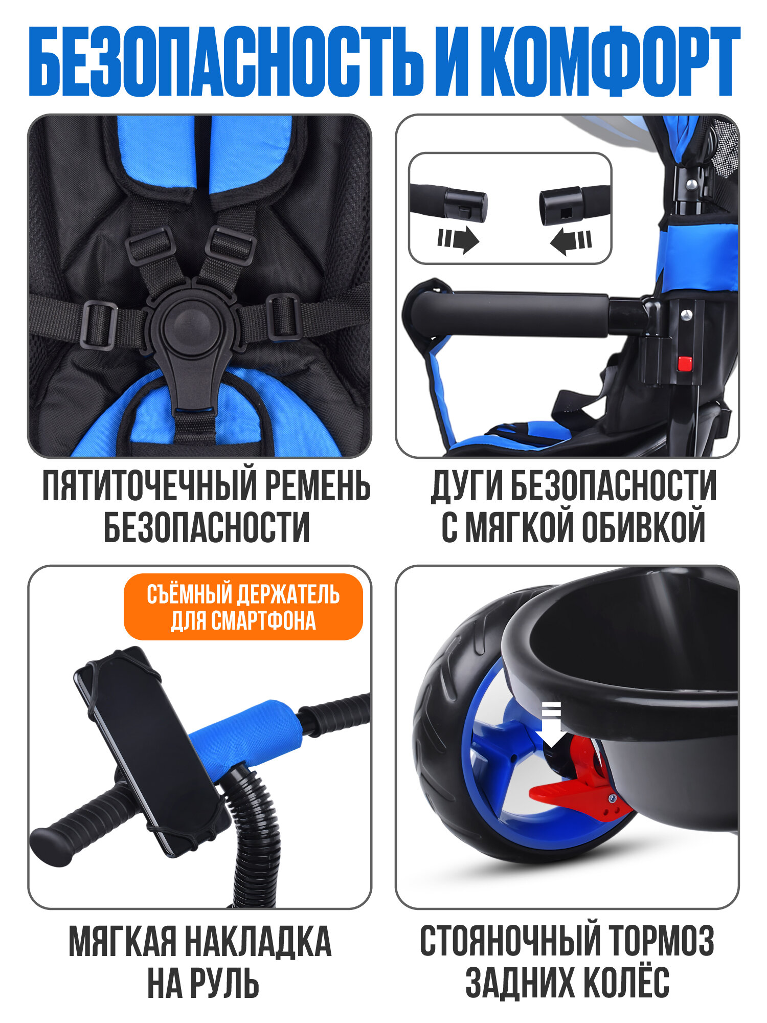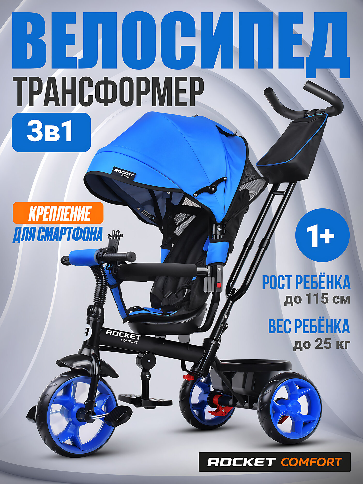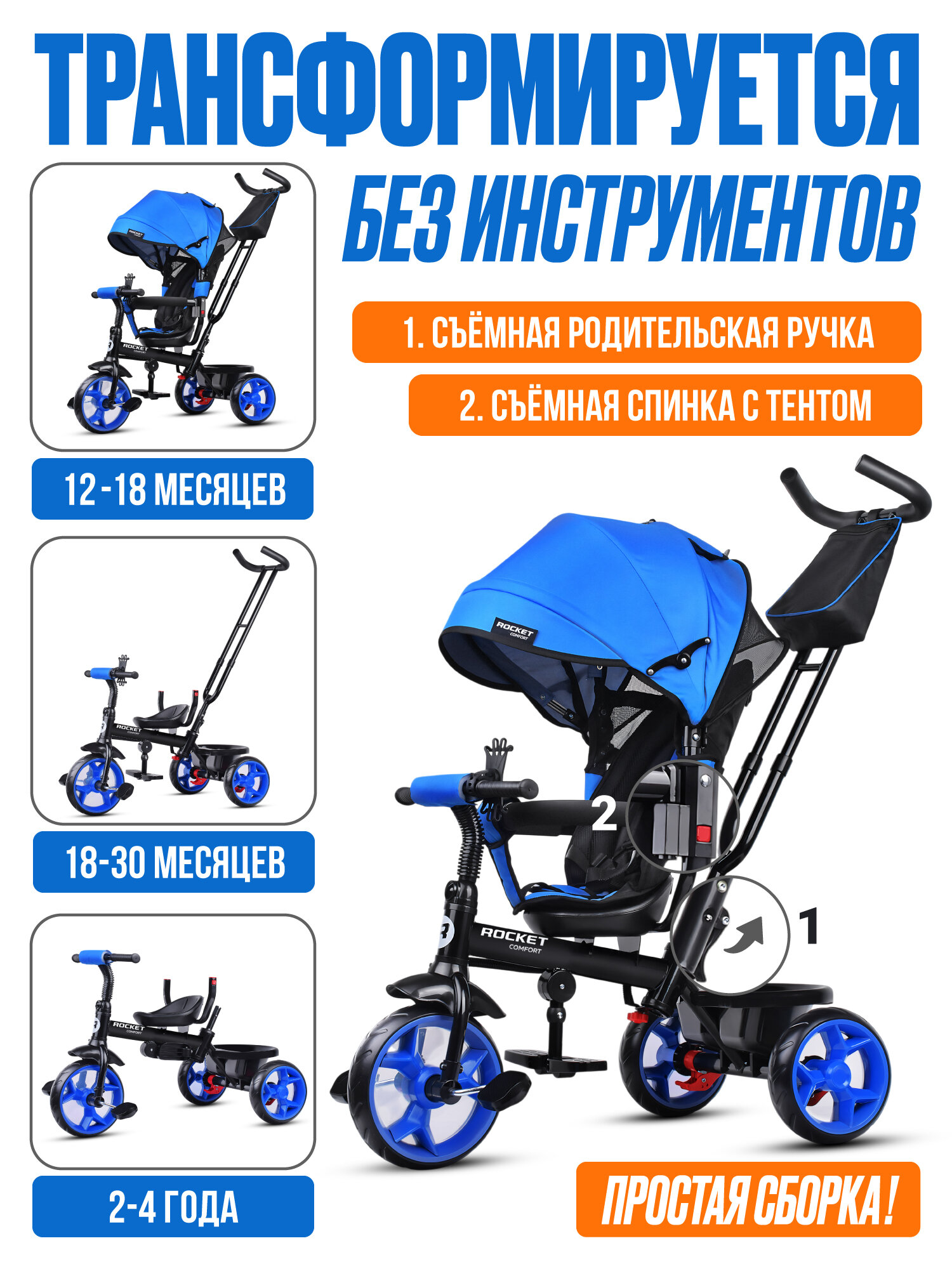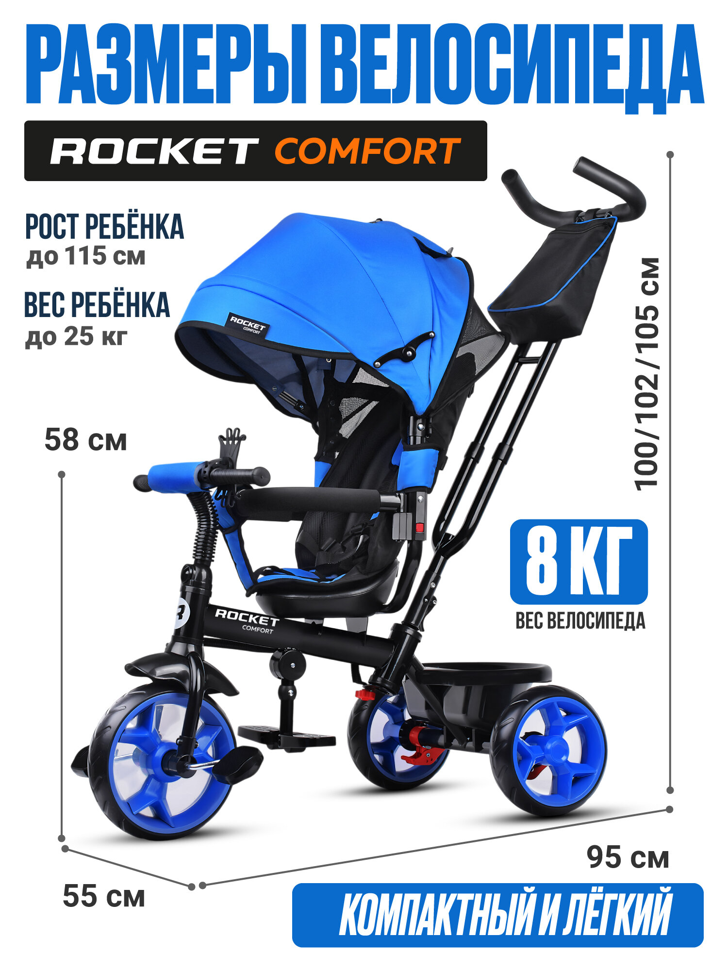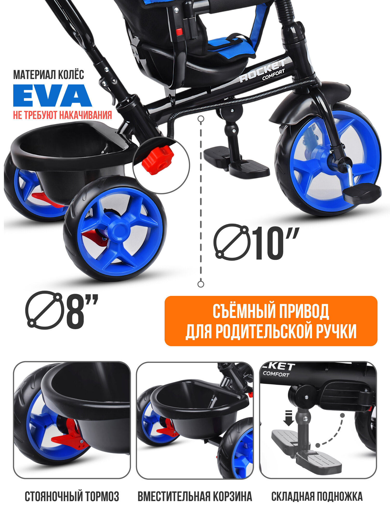 Велосипед трехколесный с родительской ручкой и козырьком Rocket Comfort, колеса EVA 10"/8", цвет синий интересное: