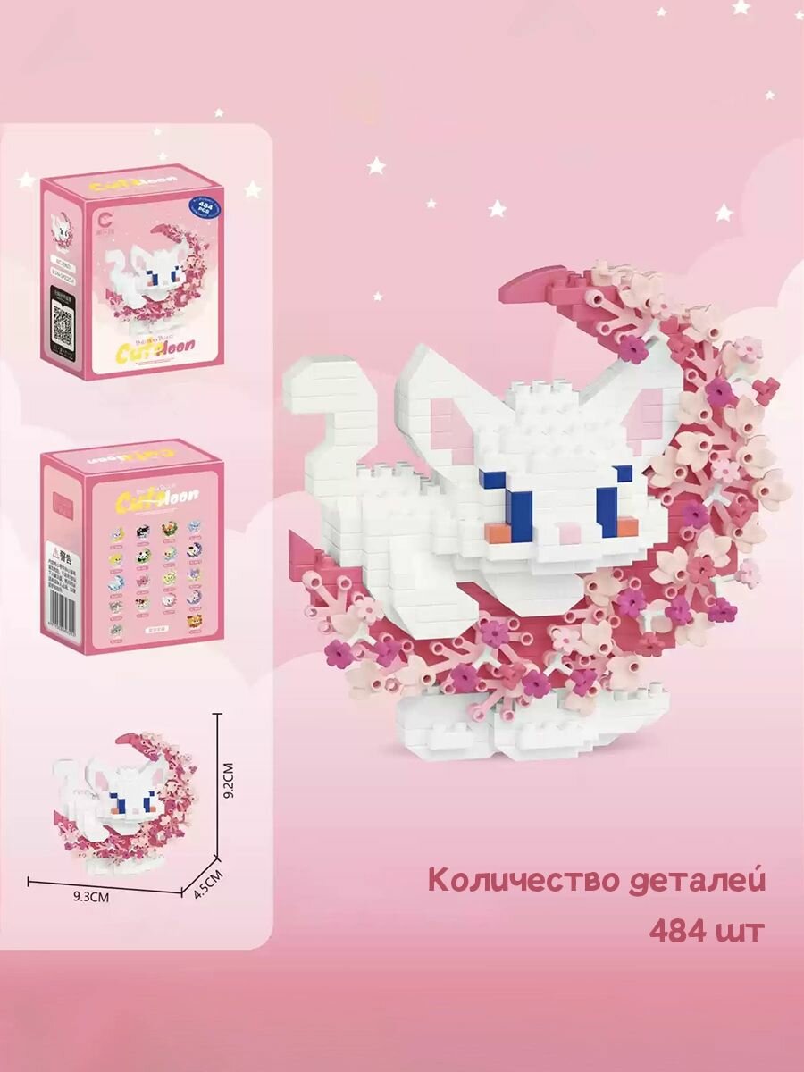 Купить Конструктор из миниблоков белый котик с цветами, 484 детали