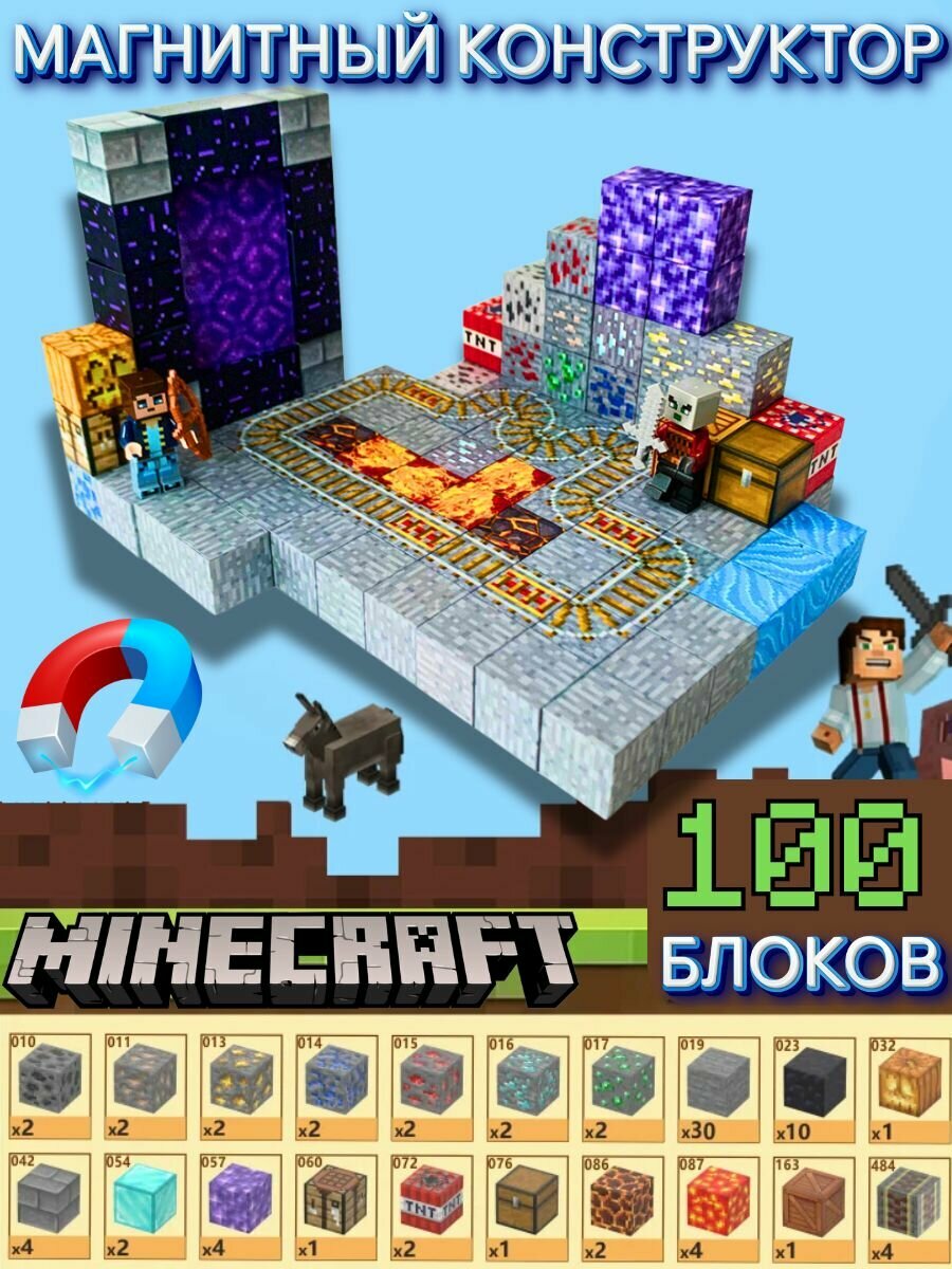 Купить Магнитный конструктор Майнкрафт 100 блоков , шахта с рельсами , minecraft