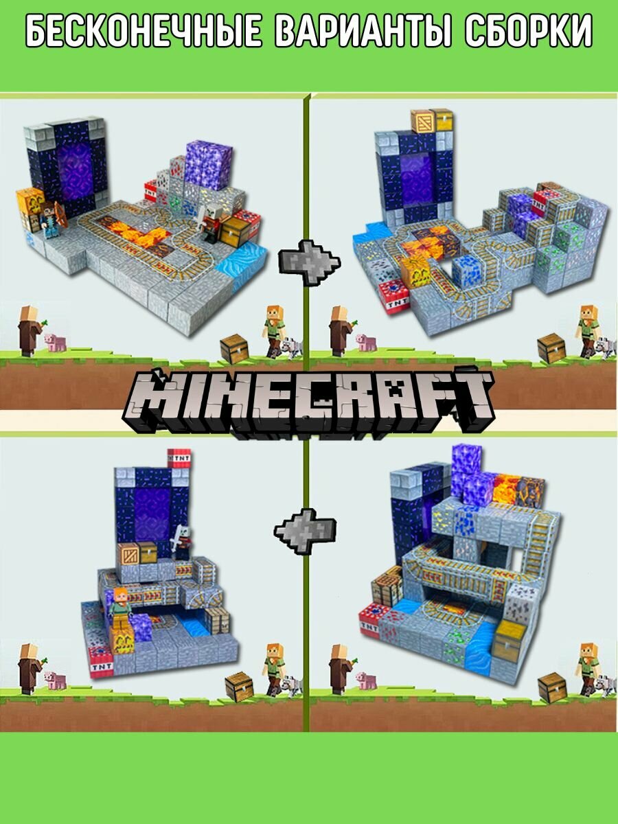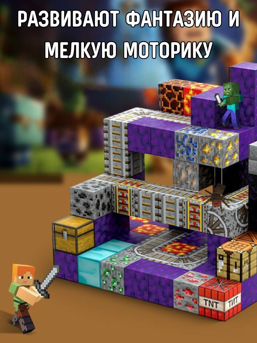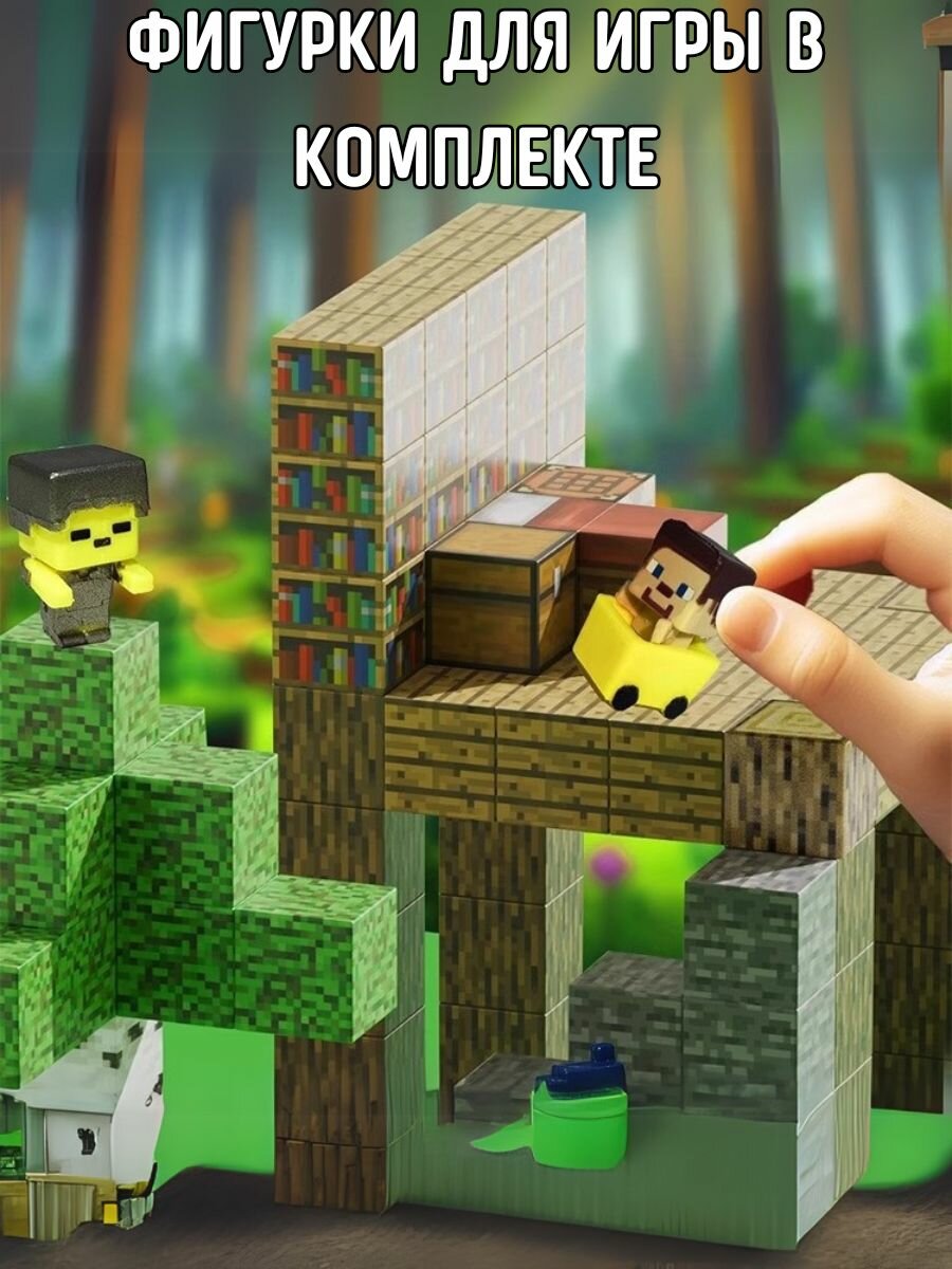 Магнитный конструктор Майнкрафт 8 блоков, 4 фигурки minecraft