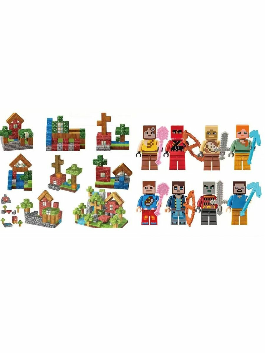 Магнитный конструктор Майнкрафт 8 блоков, 4 фигурки minecraft