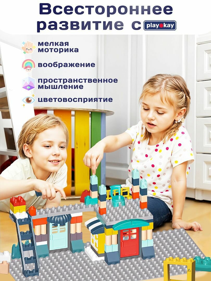 Конструктор для мальчика и девочки PlayOkay 112 элементов, с машинками, развивающий, башня, легко собирается с лего дупло