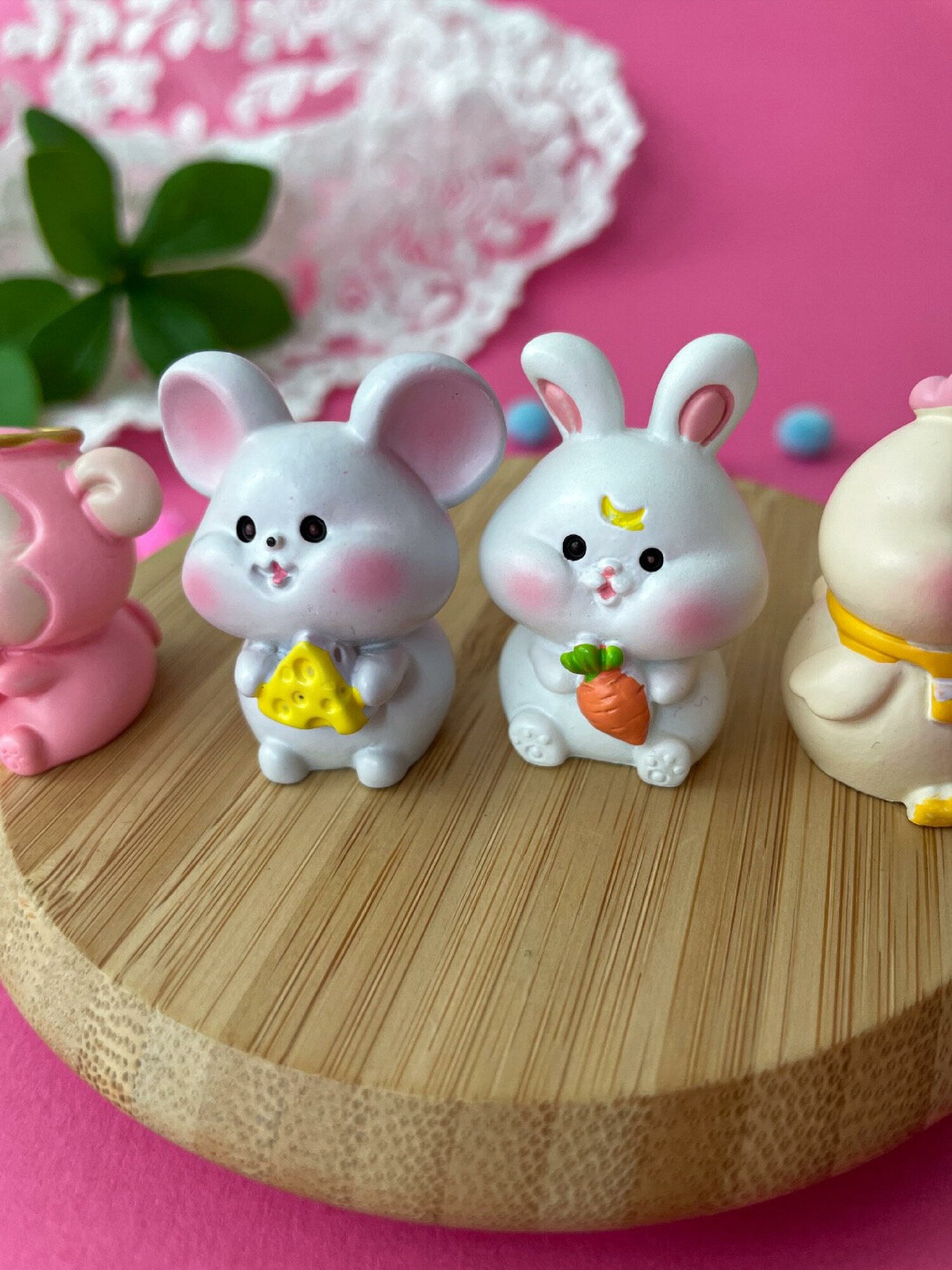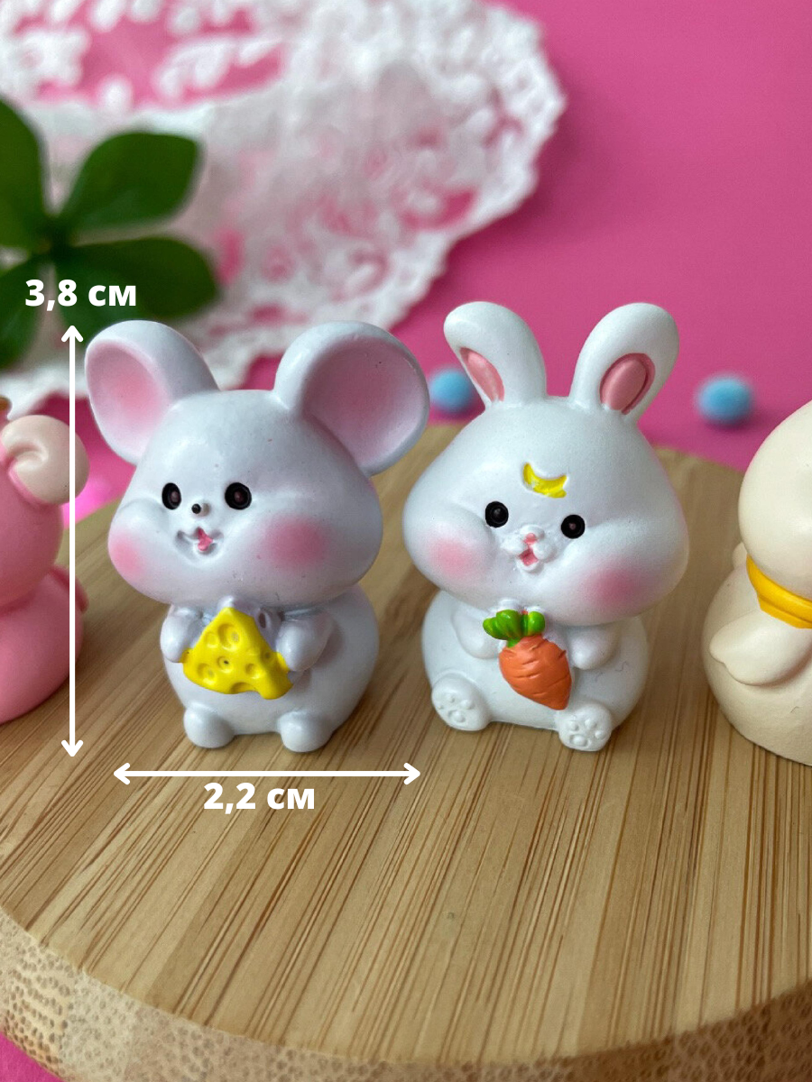 Фигурки животных, Кролики, Зайчики декоративные, с корзинкой, кукольная миниатюра, набор 5 предметов.