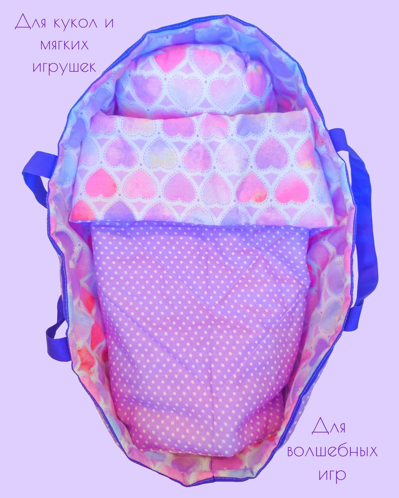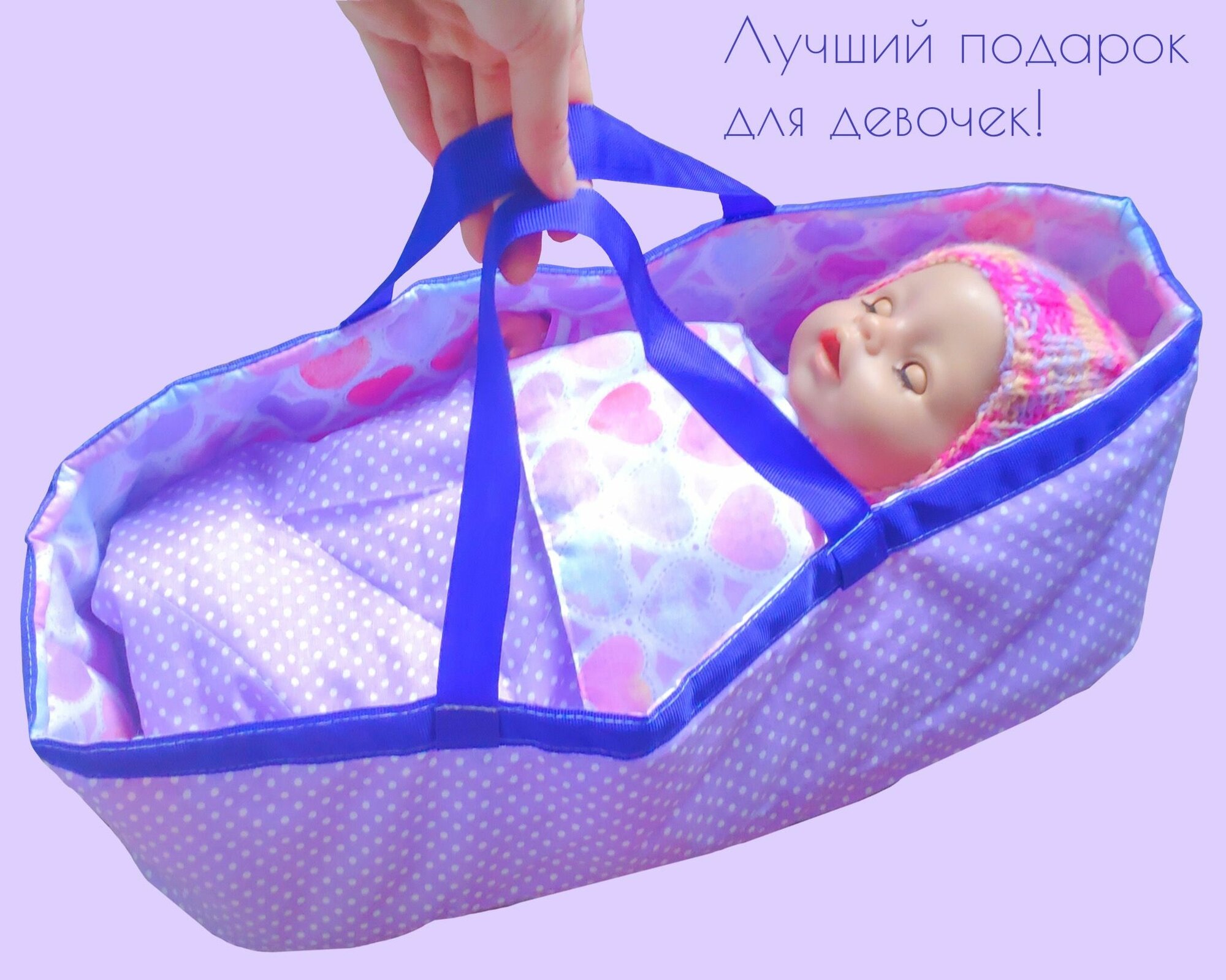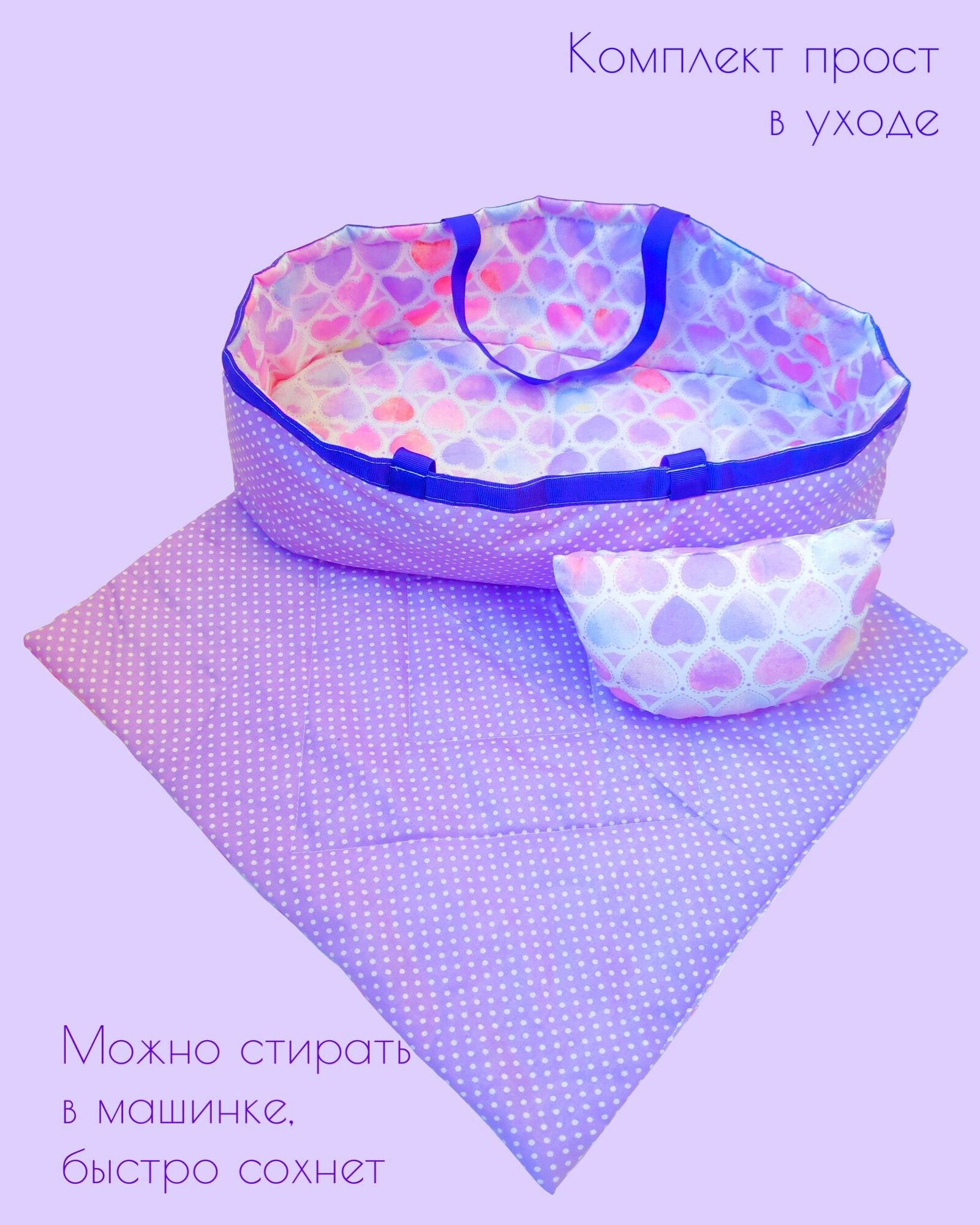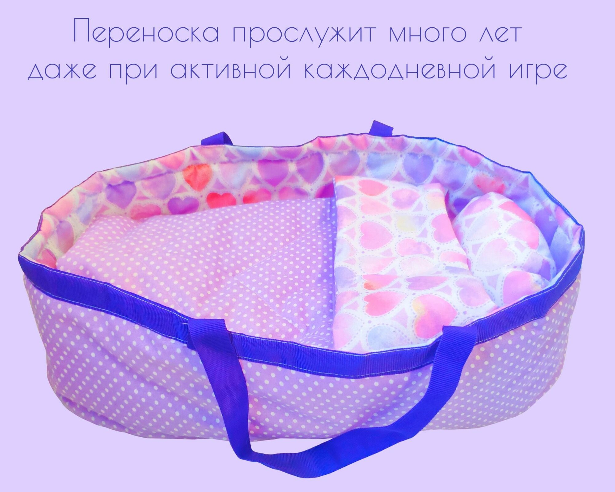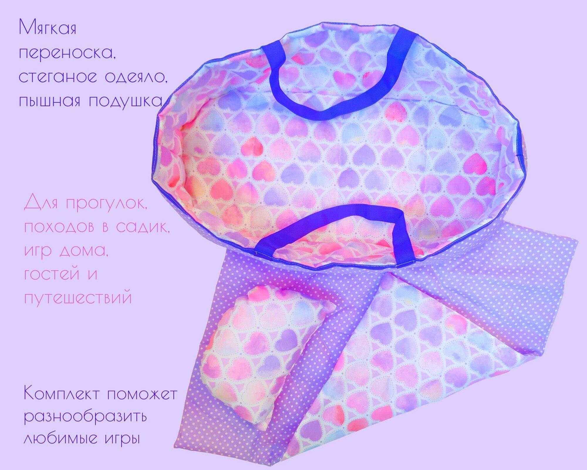 Купить Переноска с кукольным бельем, аксессуары для больших кукол "Сиреневые сердца"