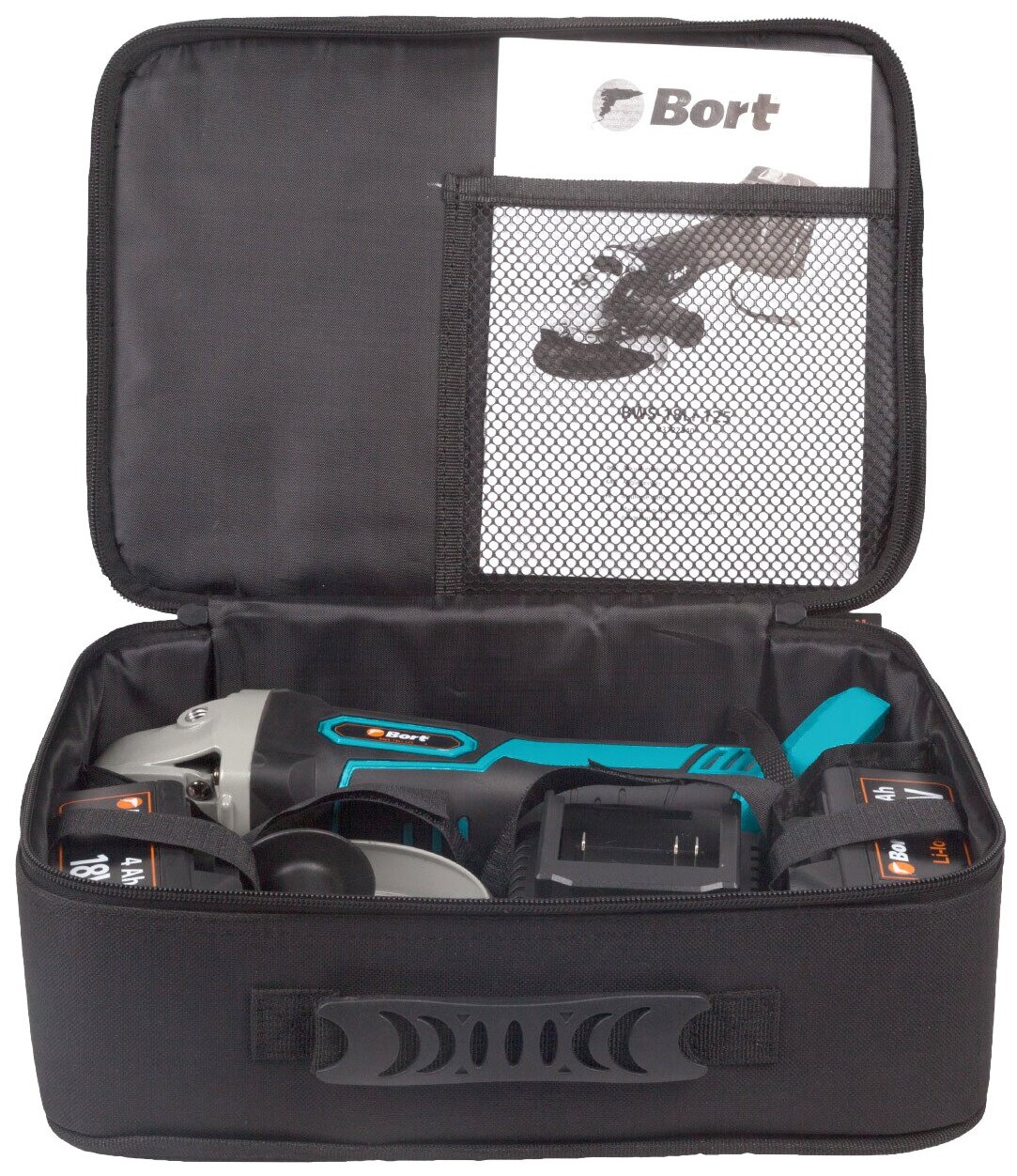 Bort Машина шлифовальная угловая аккумуляторная BWS-18Li-125 {18 В; Li-Ion ; 3 Ач; 9000 об/мин; 22,5 мм; 1,7 кг; 4 Ач; батарей 2 шт; аксессуаров 5 шт; гарантия 2 г} [93722340]