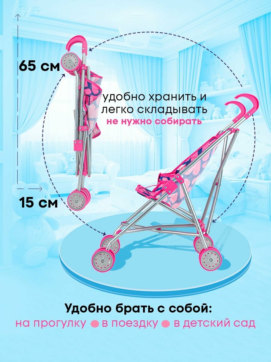 Прогулочная коляска-трость для кукол до 40 см. Размеры 55х26х52см. Подарок для девочек 3+ Артикул 9302-6F интересное: