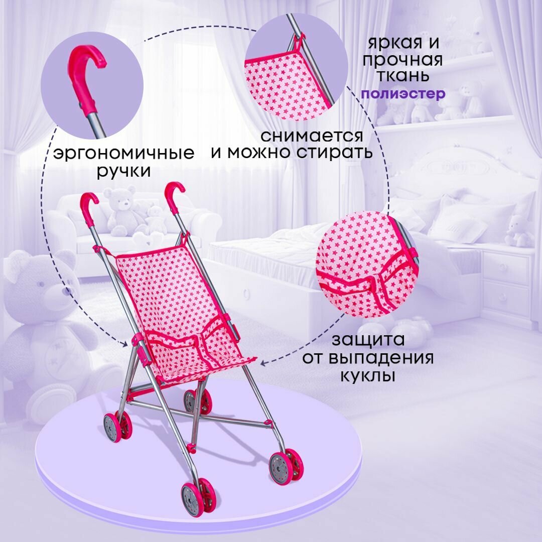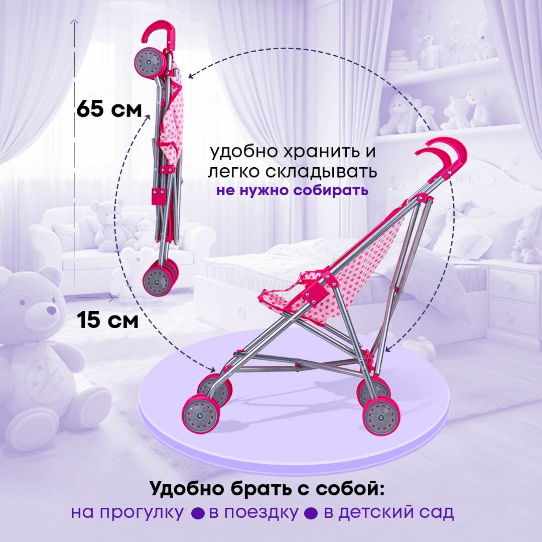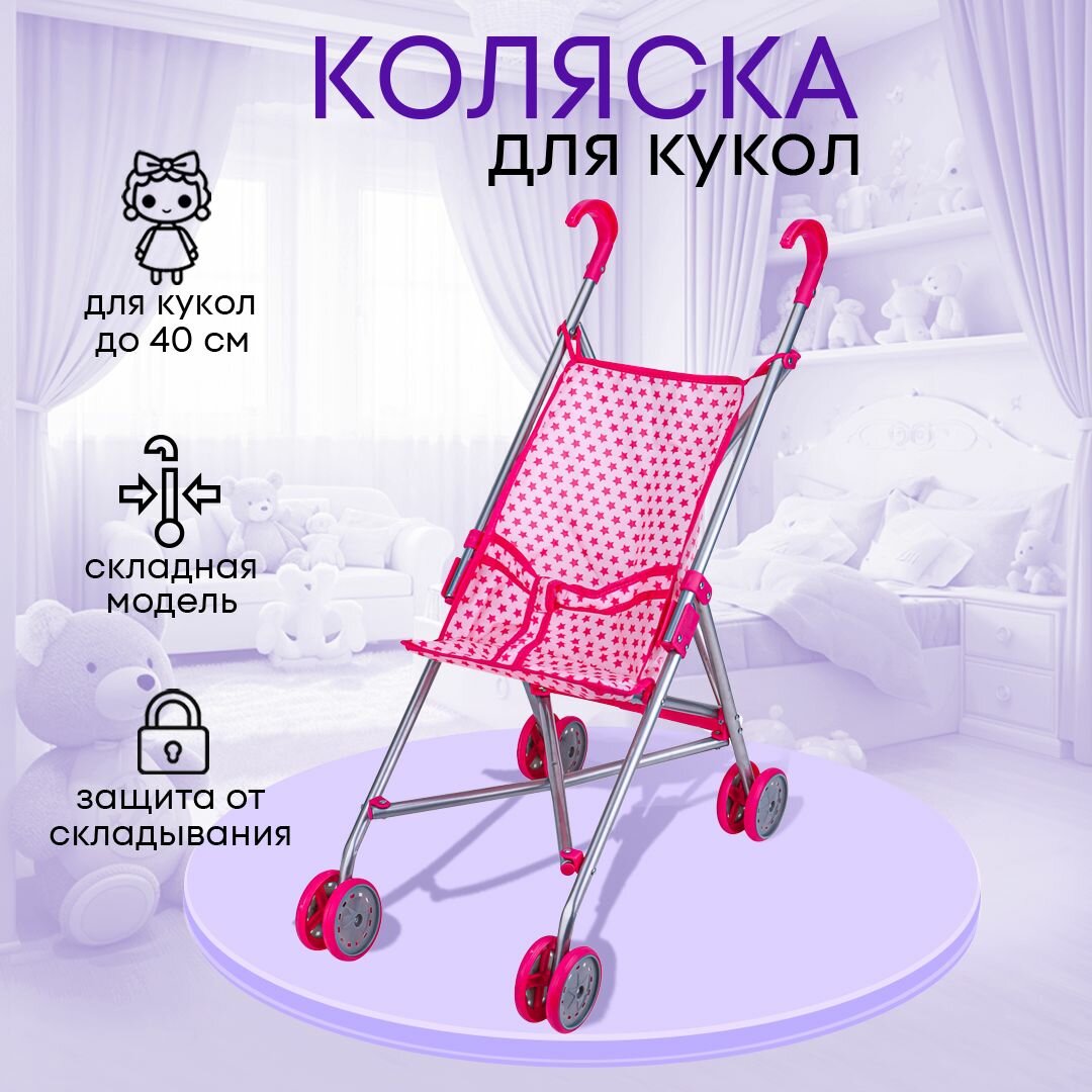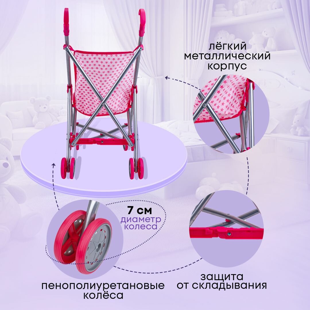 Прогулочная коляска-трость для кукол до 40 см. Размер 55х26х52 см. Складная, металлическая. Подарок для девочек 3+ интересное: