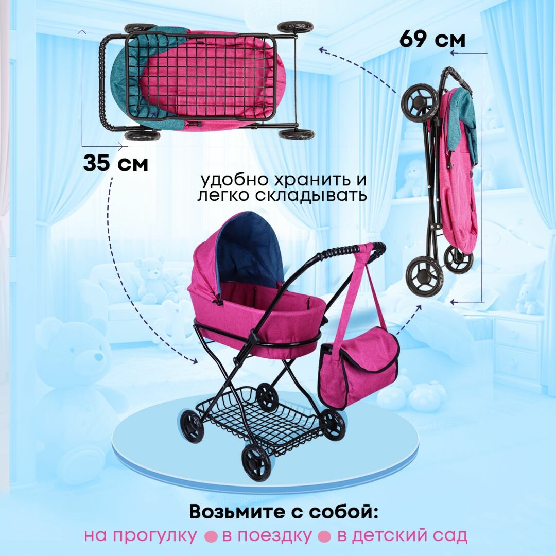 Купить Коляска детская для кукол до 45 см с люлькой и сумкой, металлическая, размеры 63х35х71см. Подарок для девочек 3+ Артикул 9325-F