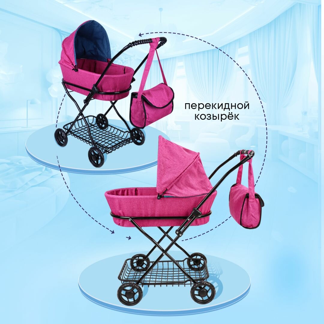Коляска детская для кукол до 45 см с люлькой и сумкой, металлическая, размеры 63х35х71см. Подарок для девочек 3+ Артикул 9325-F интересное: