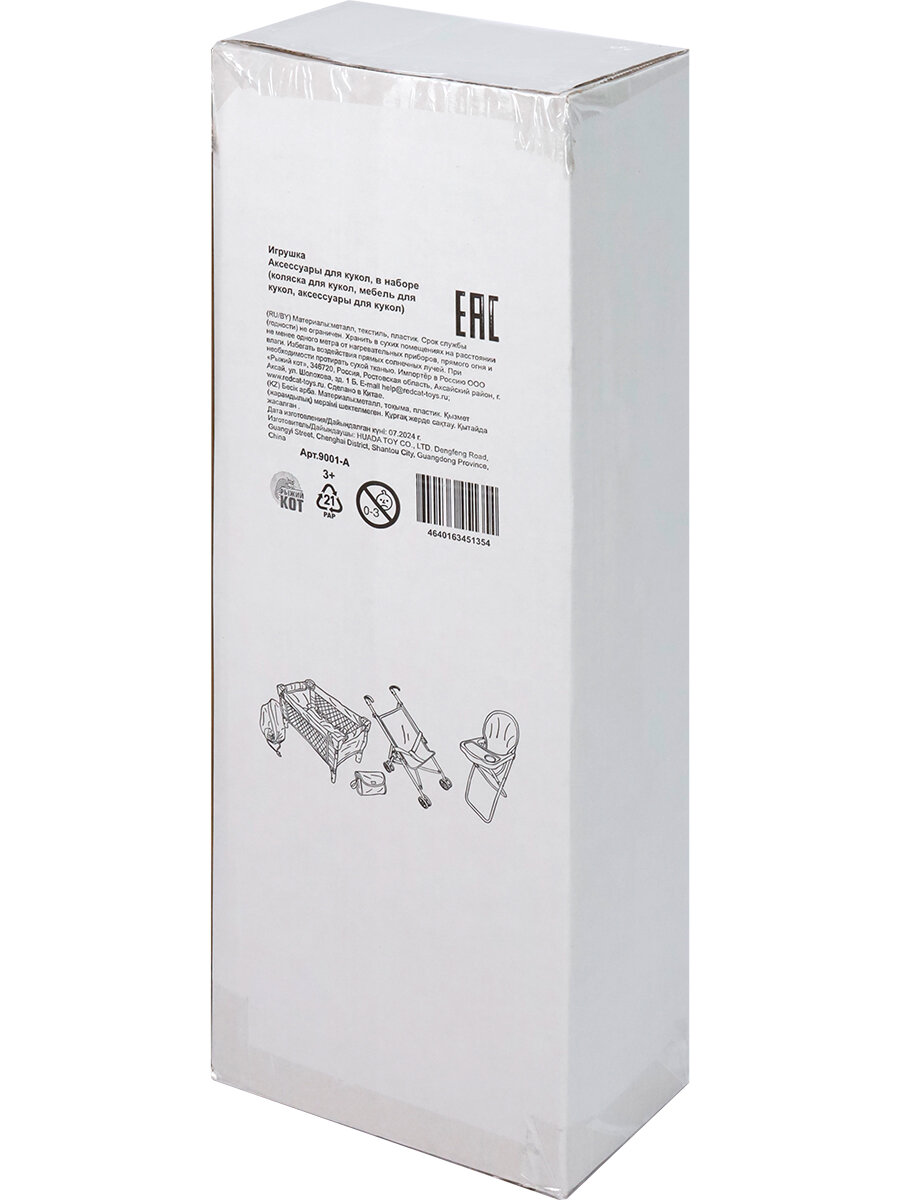 | Комплектация | В комплект входит: коляска-трость (54х50х28 см) / стульчик для кормления (56х33х23 см) / кроватка-манеж (54х33х33 см) / матрас на липучках (50х30см) / сумка для хранения (30х24х17 см). Набор поставляется в коробке / что обеспечивает безопасность и сохранность товара во время транспортировки. |