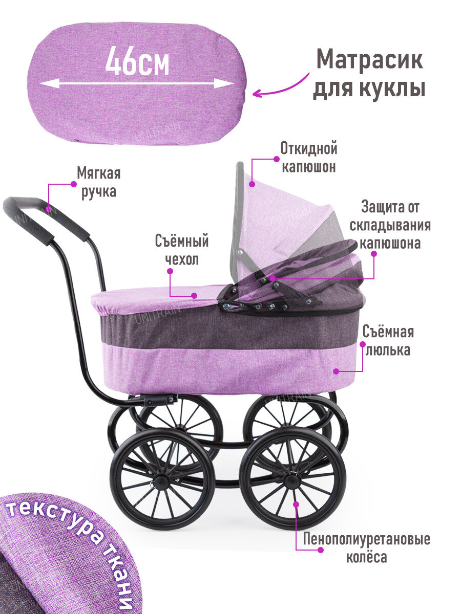 Детская коляска люлька для кукол до 45 см, металлическая, сиренево-серая интересное: