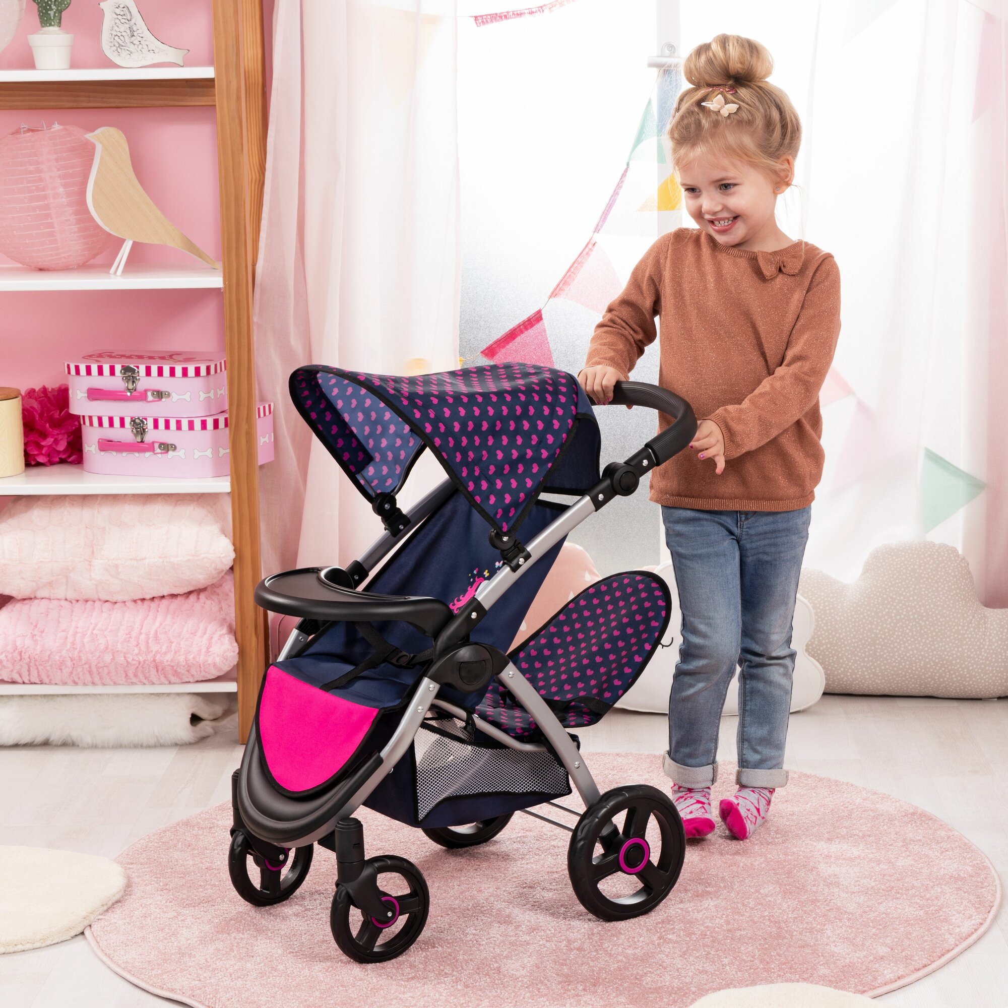 Коляска для двух кукол Twin Star синяя с единорогом интересное: