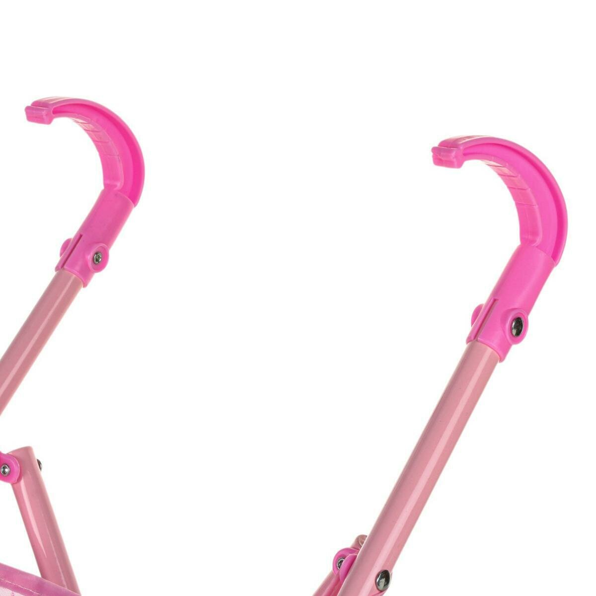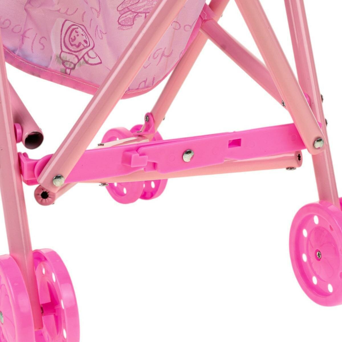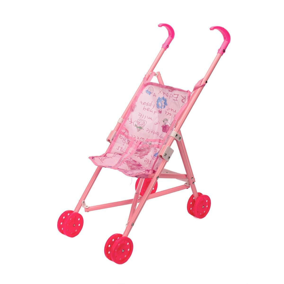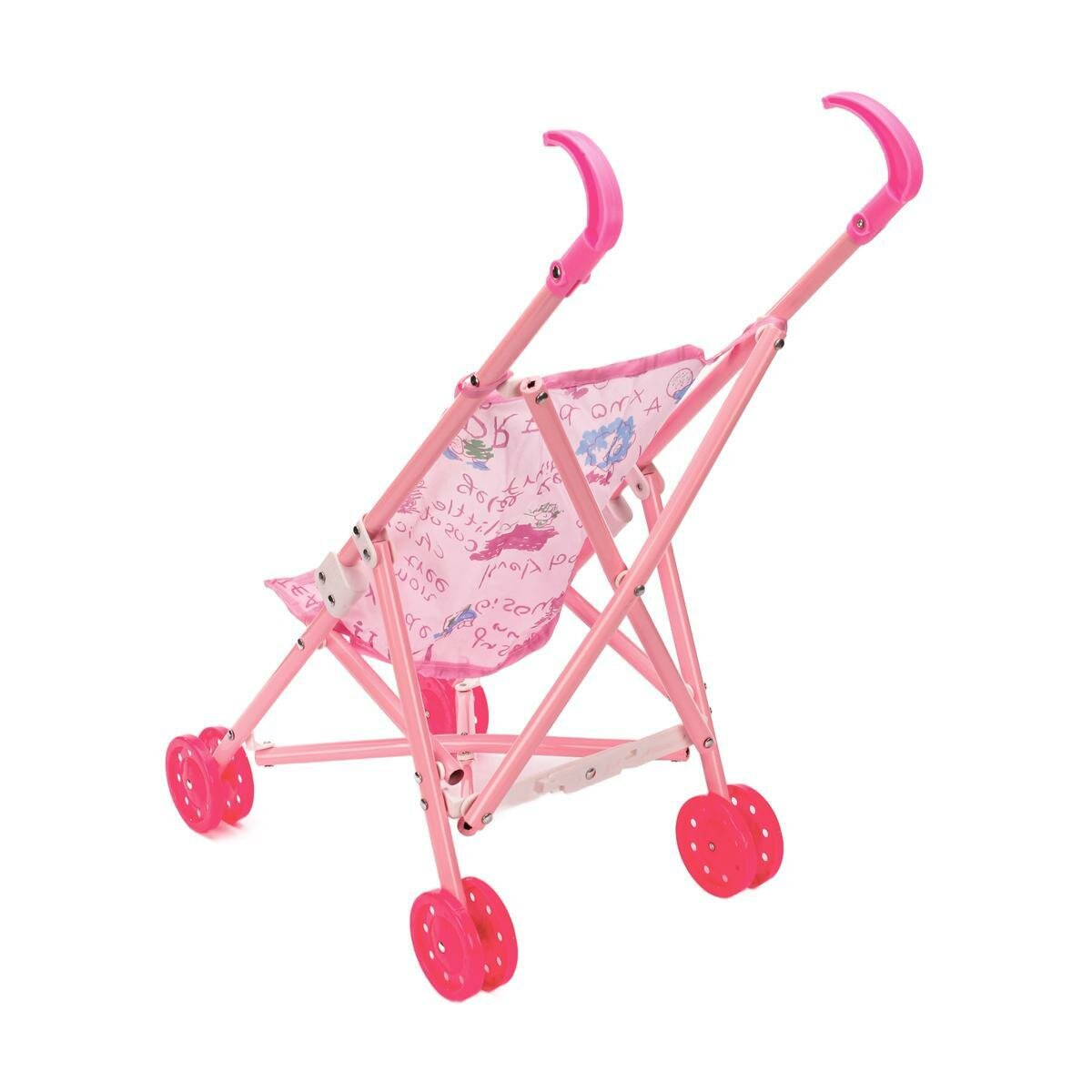 | Дополнительная информация | коляска-трость для кукол, легкая и складная конструкция, выполнена в розовом цвете, каркас из металла, сиденье из текстиля с рисунком, четыре пластиковых колеса, удобные ручки |