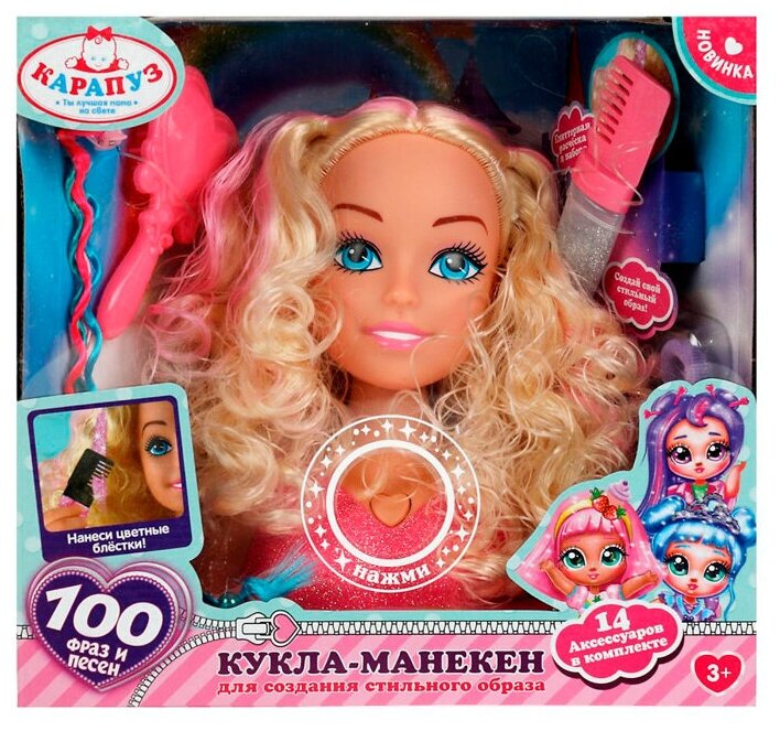 Купить Кукла-манекен Карапуз 20 см для создания причесок, 100 фраз и песен, в наборе 14 аксессуаров