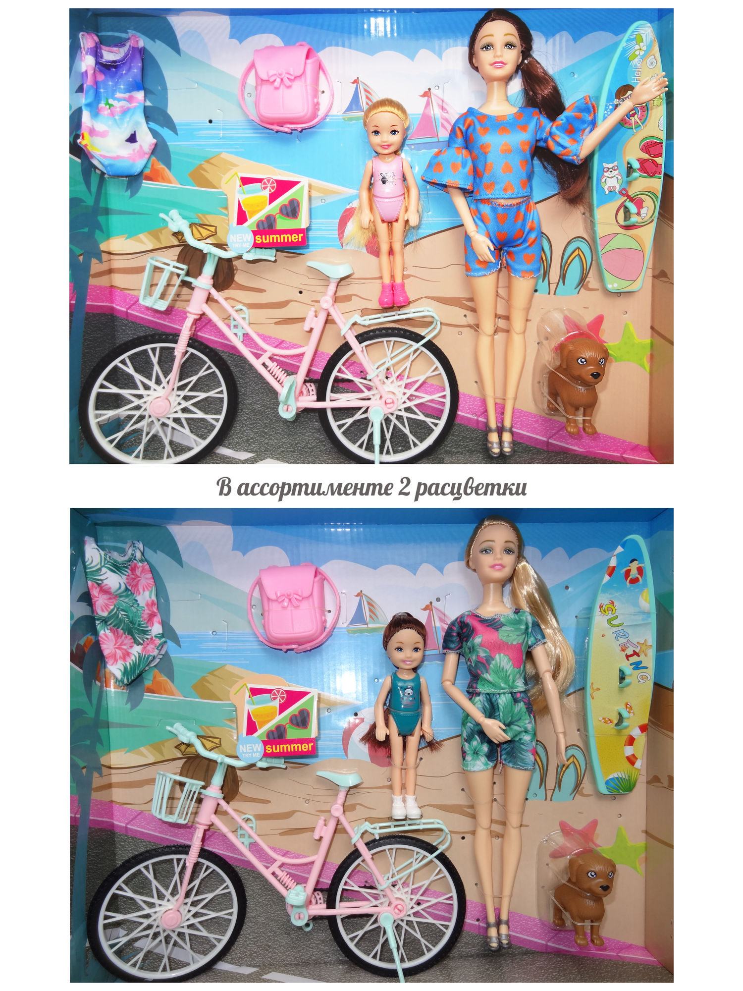 Купить Кукла для девочек шарнирная 29 см на велосипеде с ребенком 14 см, питомцем и аксессуарами для пляжа