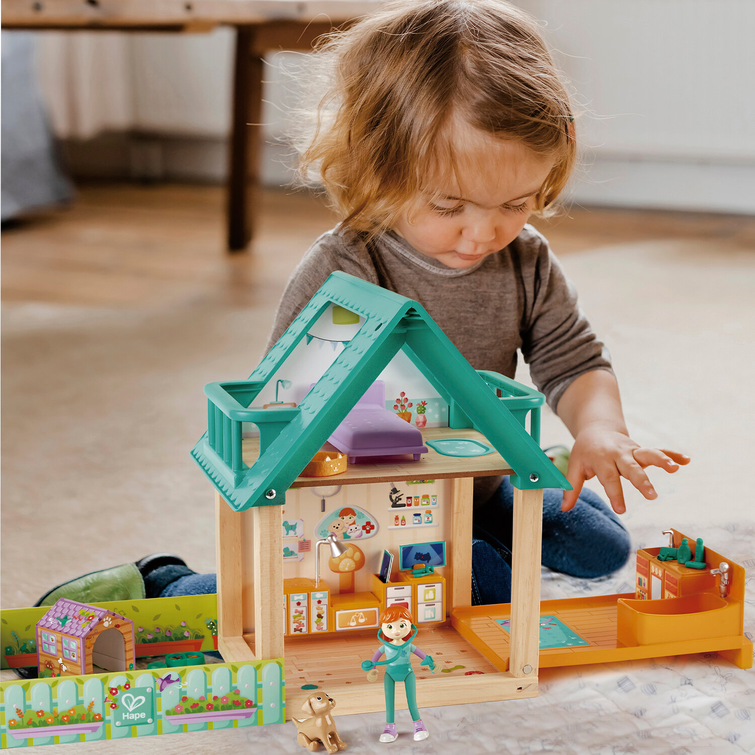 Купить Деревянный кукольный домик Hape "Ветеринарная клиника", с аксессуарами, куклой в наборе, для кукол 15 см E3408_HP