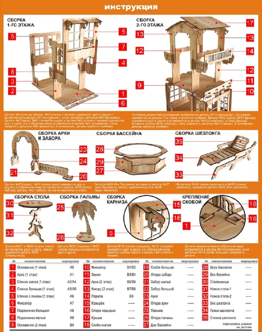 | Комплектация | В КОМПЛЕКТЕ: 85 деталей для сборки домика37*62*69 см с забором / шезлонга23,5*8*8,5 см - 2шт. / пальмы7,5*5*14 см - 2 шт. / бассейна26*26*4,6 см |