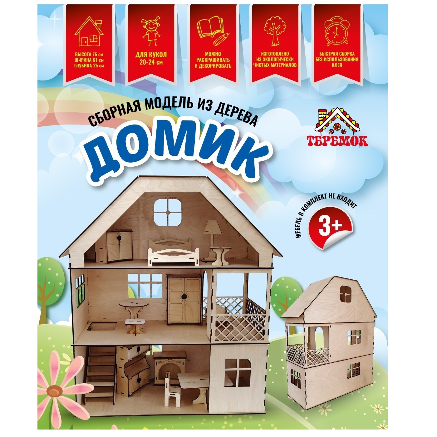 Кукольный домик Теремок №5-2, дерево, для кукол высотой 15-20см, 3 этажа интересное: