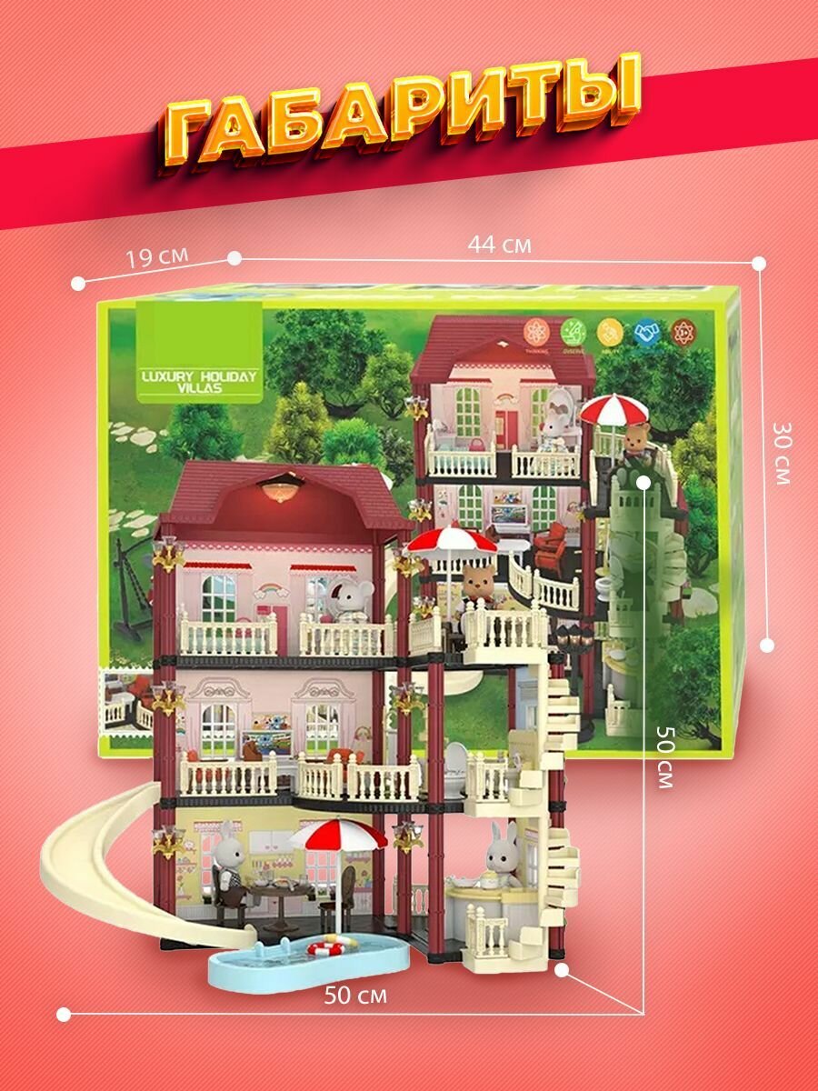 Кукольный домик "Загородная Вилла", для девочек, 3 этажа, с мебелью и горкой интересное: