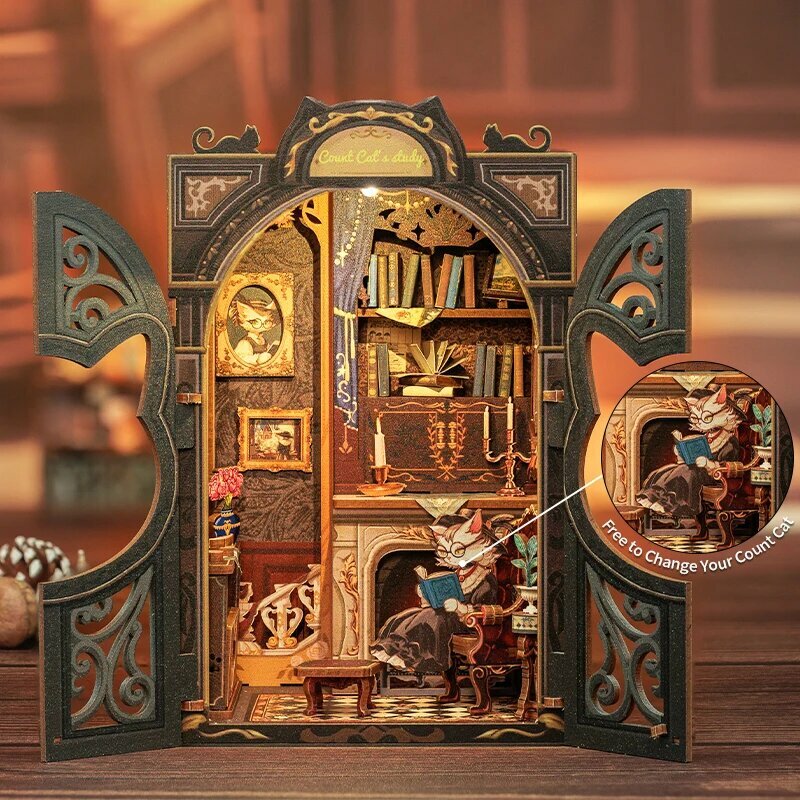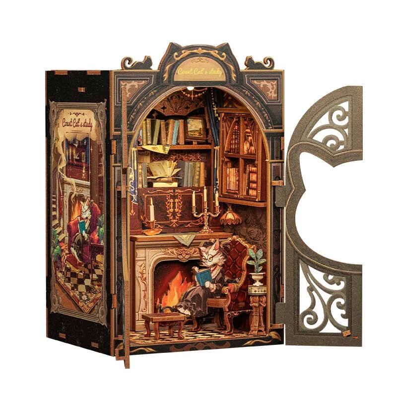 CUTEBEE DIY деревянный кукольный домик Booknook с подсветкой, Count Cat Study интересное:
