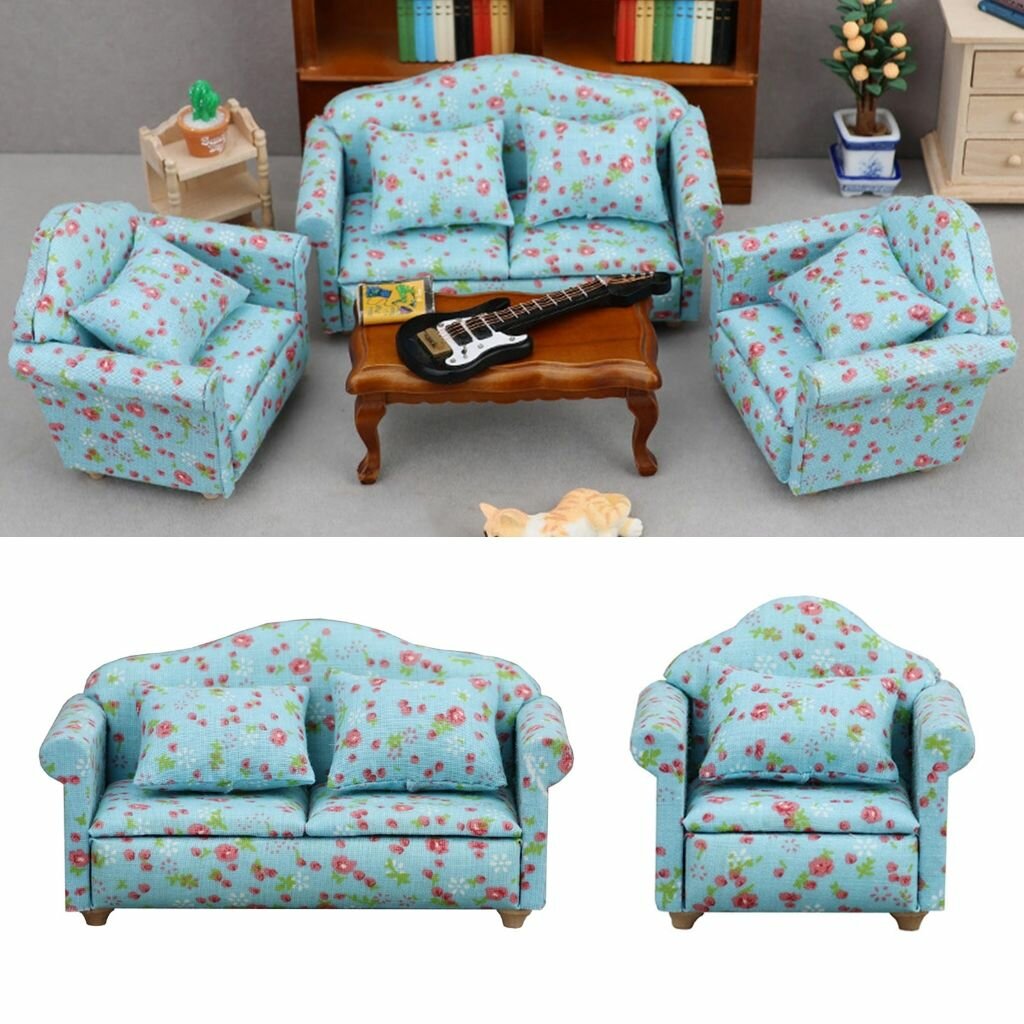 1:12 кукольный домик диван с красным цветочным узором на синем фоне - комплект из 3 предметов, 1 набор интересное: