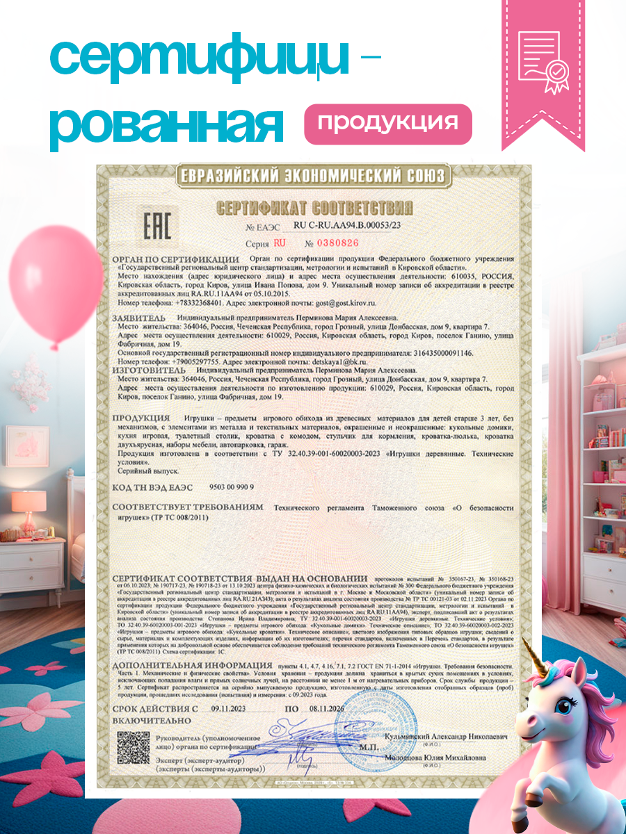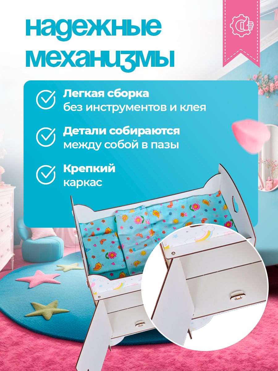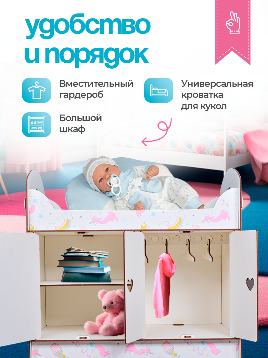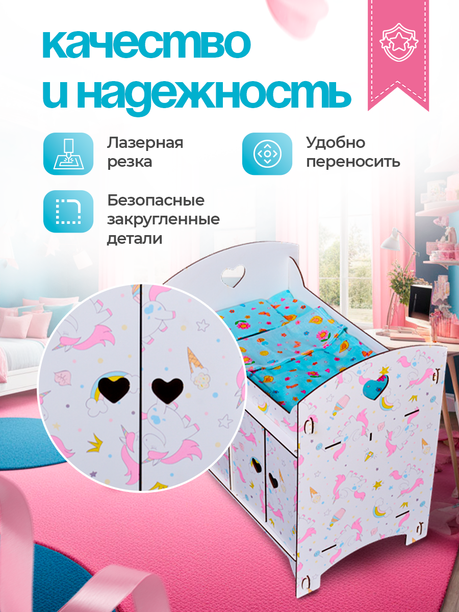 Кроватка со шкафом игрушечная детская для кукол деревянная Единорог / Постельное белье в подарок интересное:
