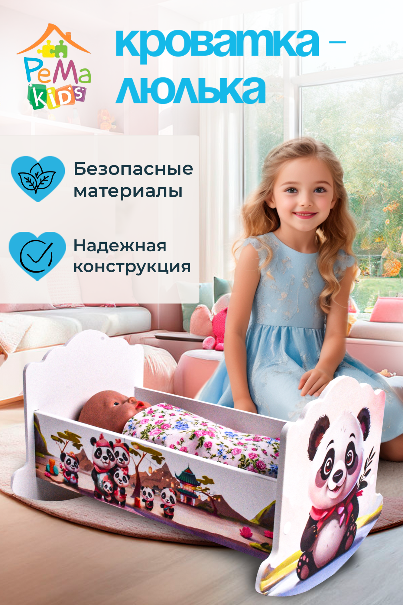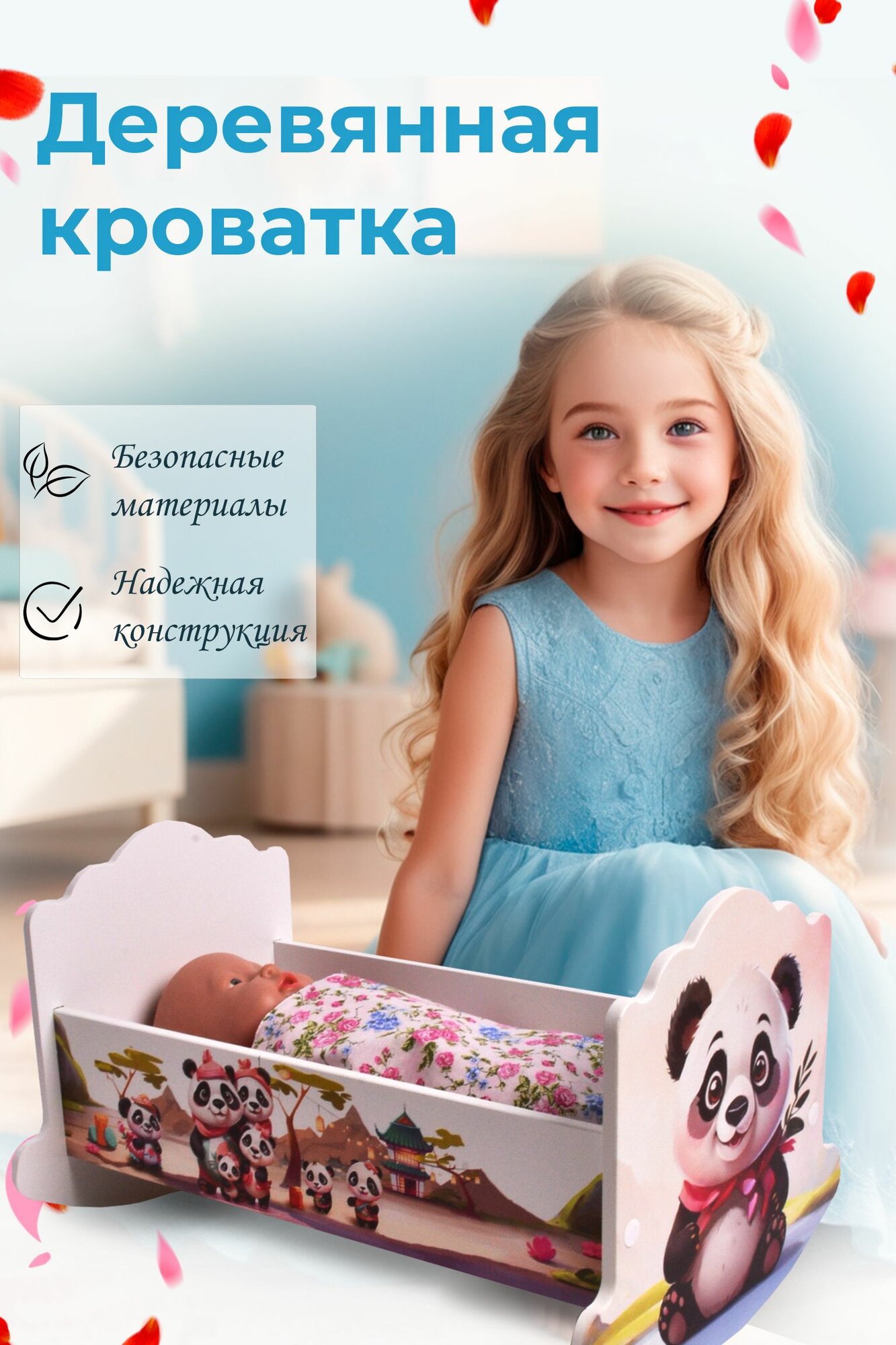 Кроватка-качалка игрушечная люлька детская деревянная для куклы 41 см / Постельное белье в подарок Панда принт интересное: