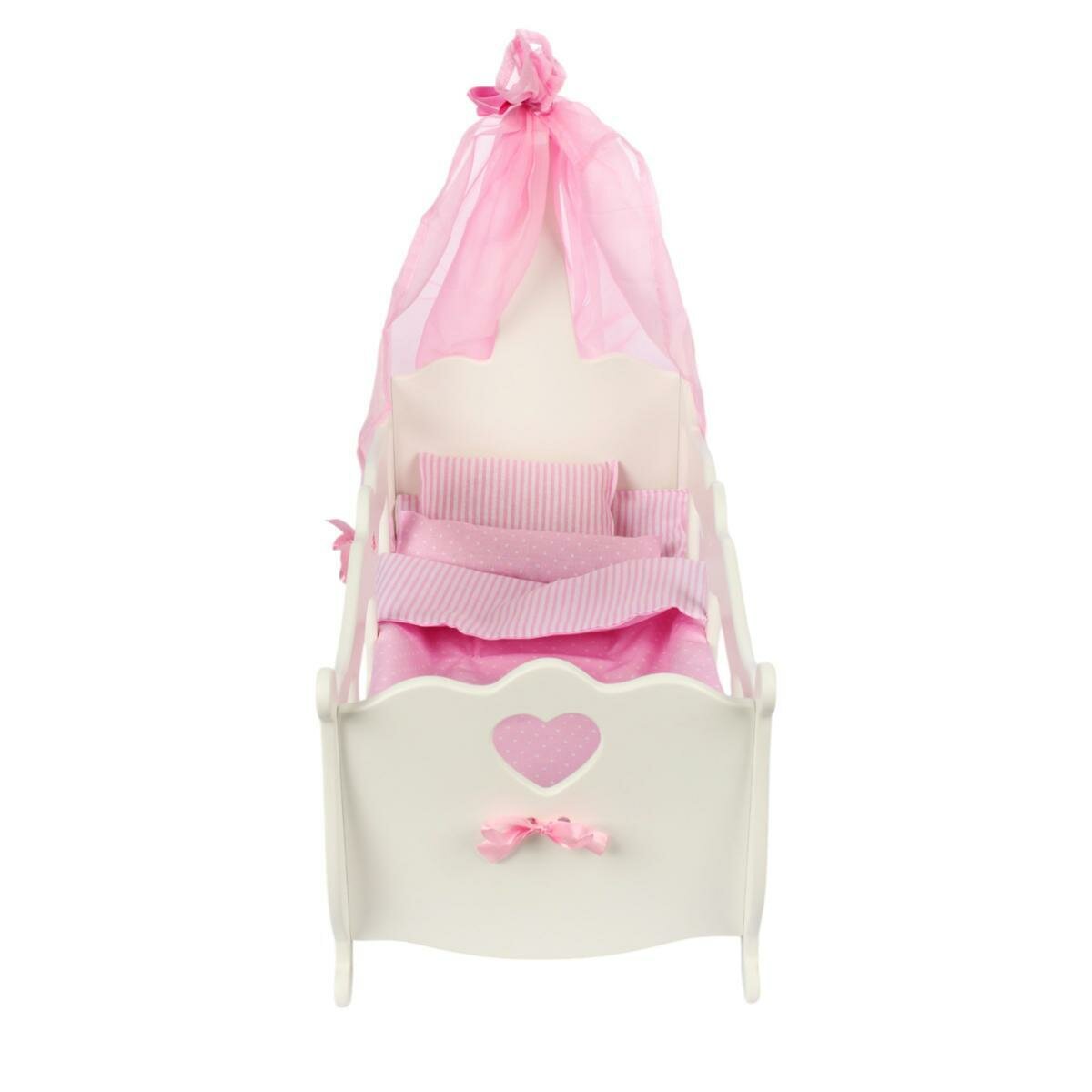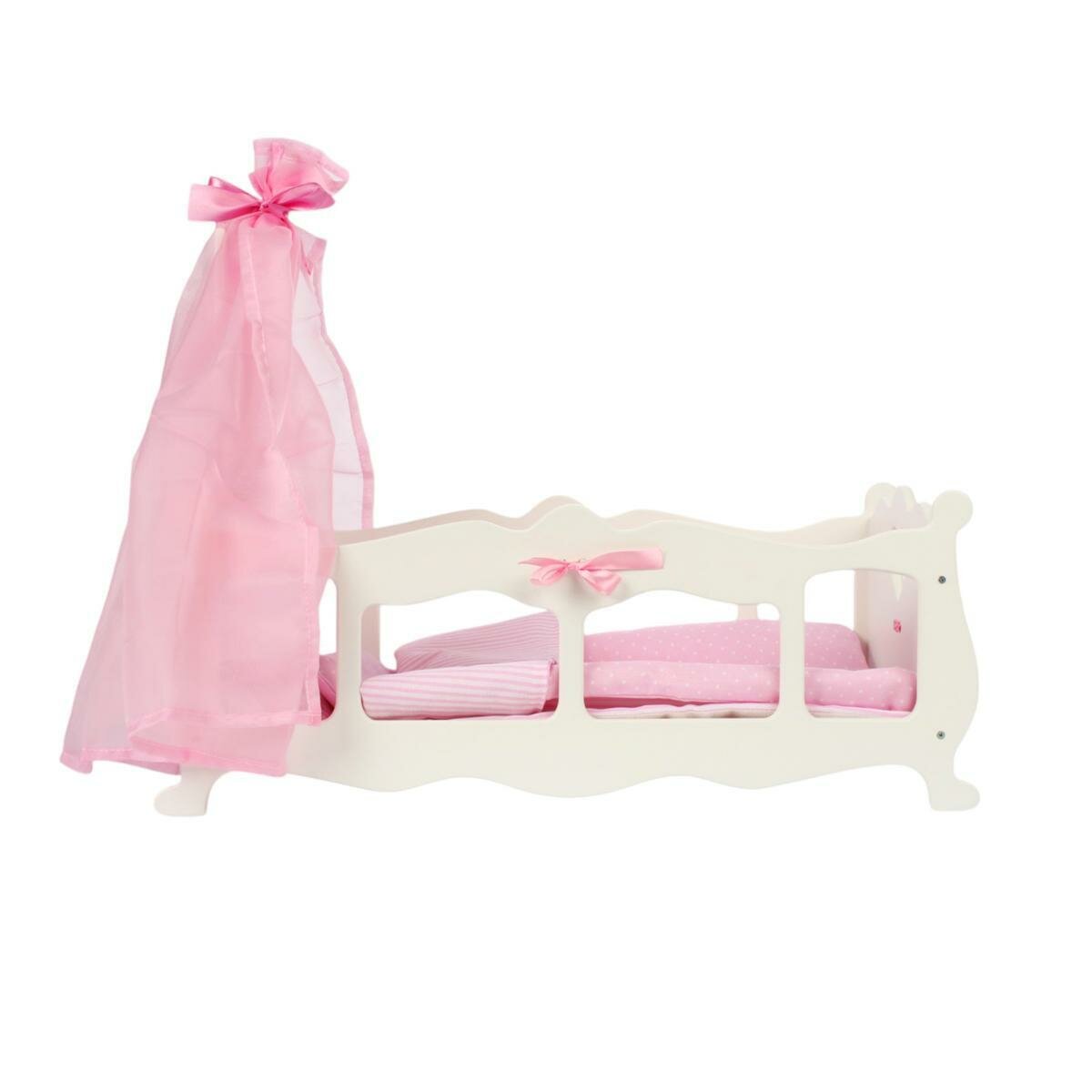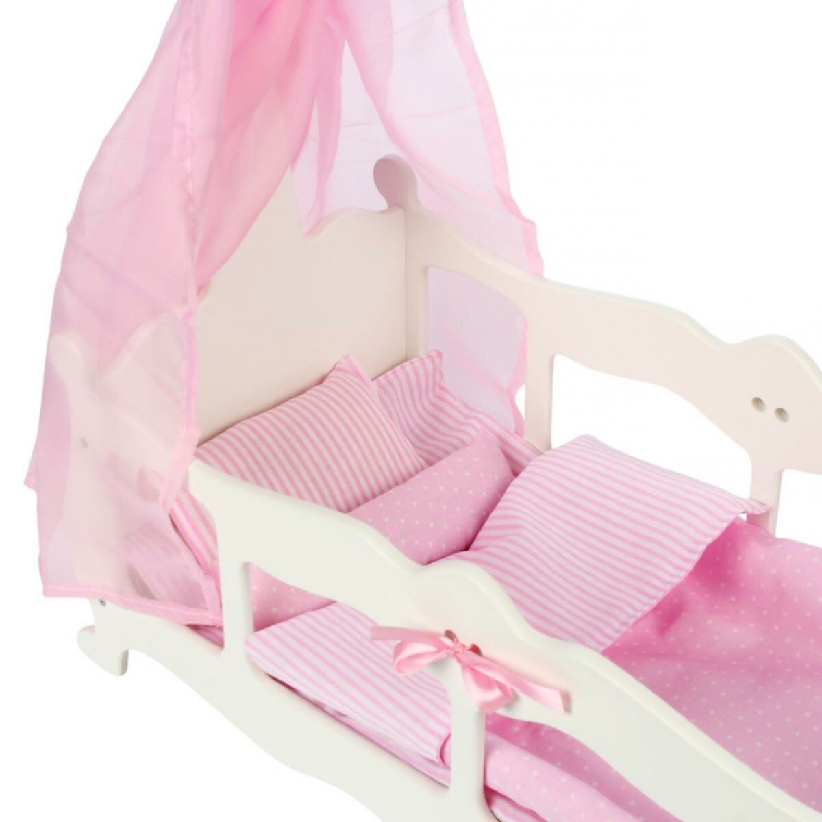 | Комплектация | кроватка, стразы, атласные ленты, балдахин, подушка прямоугольная, подушка-валик с лентами, мягкий матрасик, увеличенное теплое одеялко |
