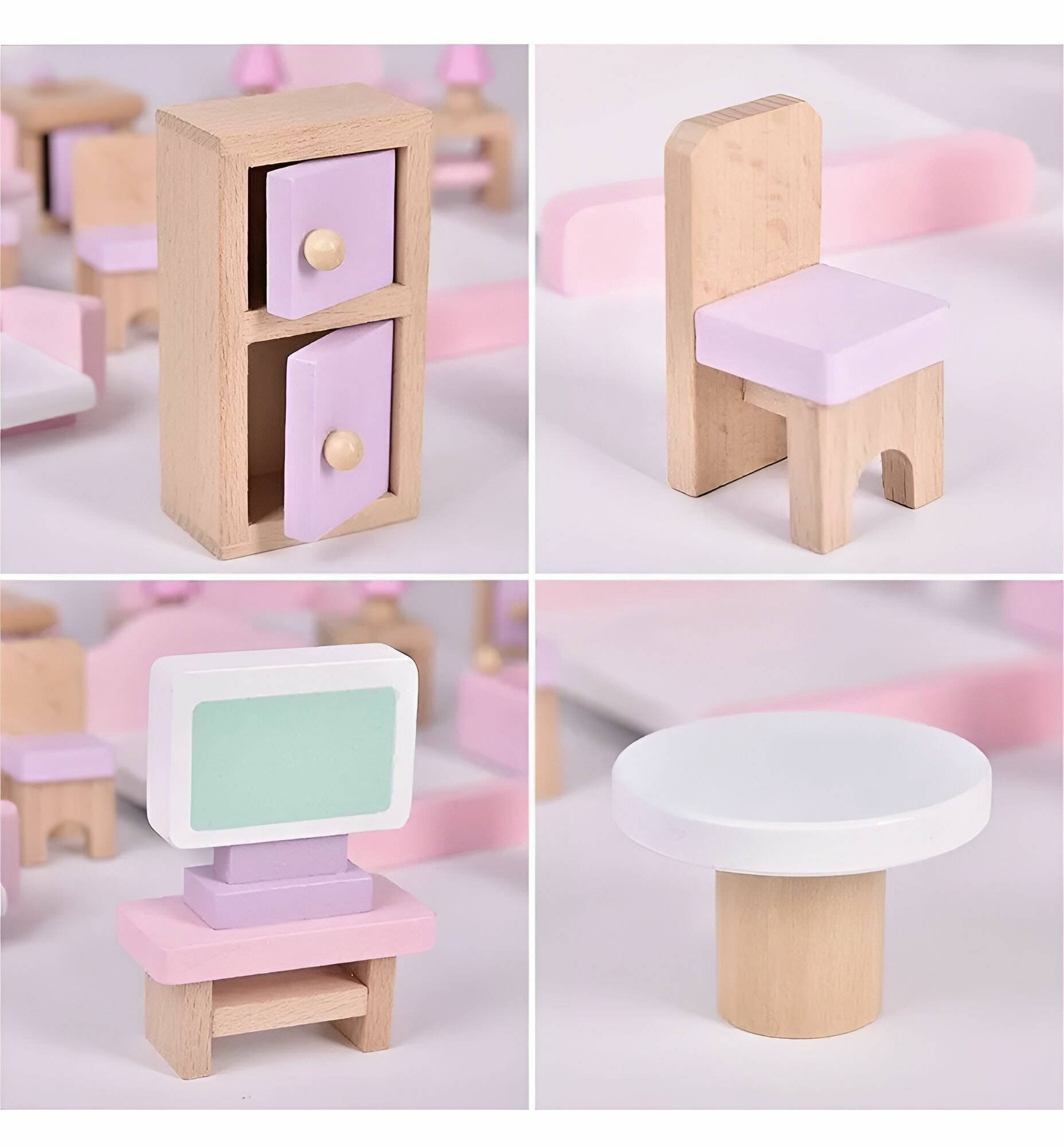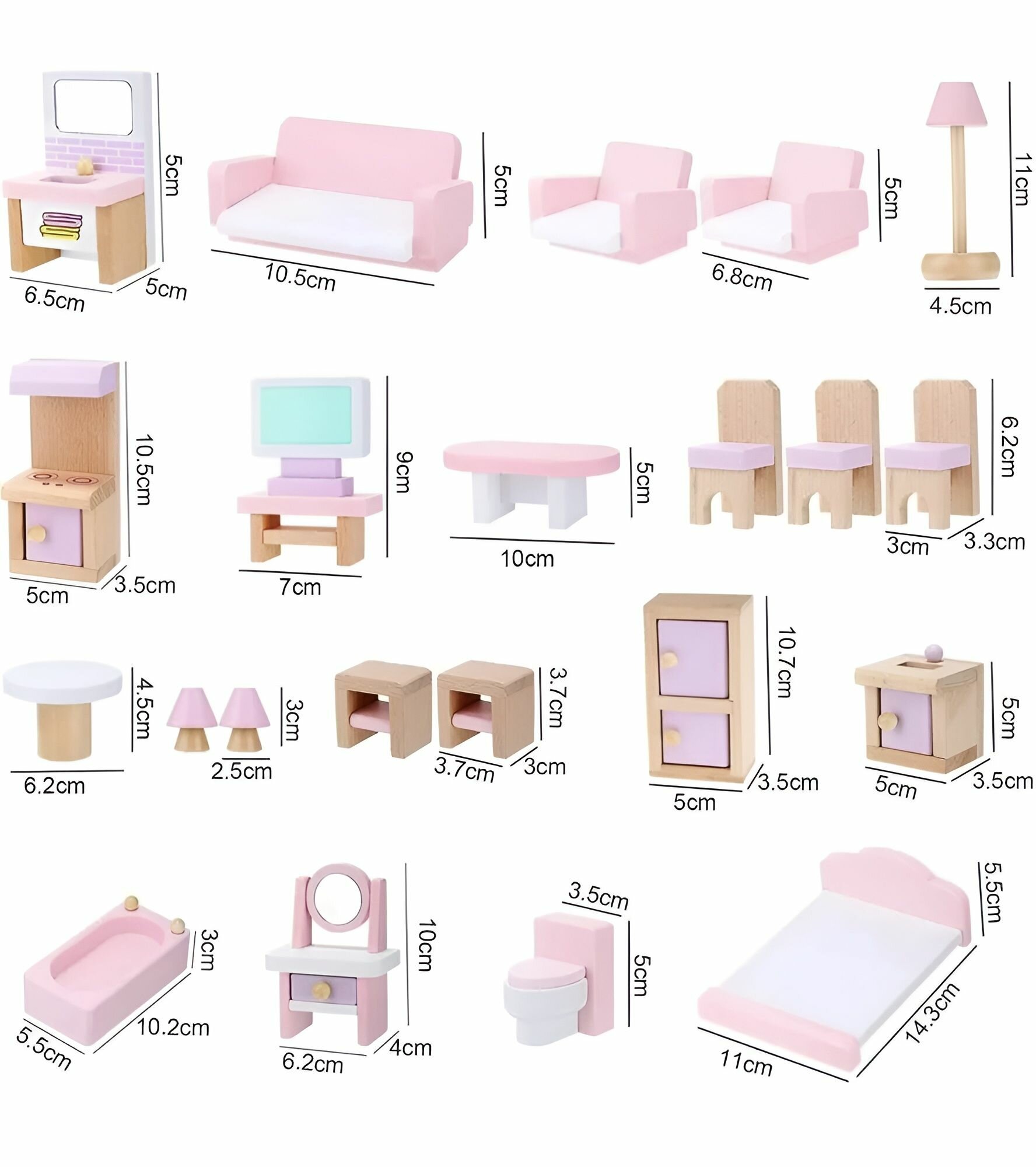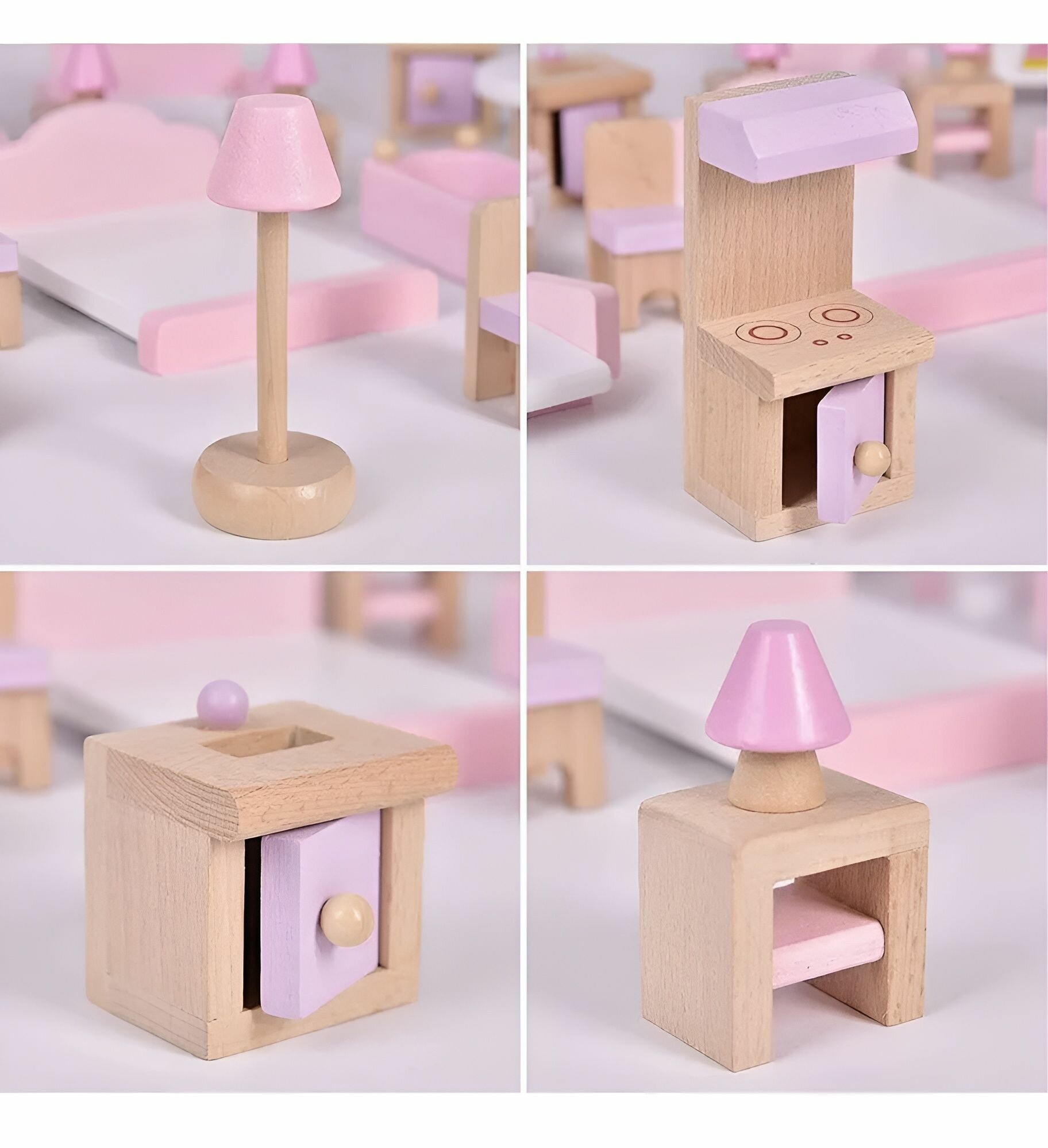 Купить Деревянная мебель для кукольного домика, набор детских игрушек, розовый, 22 предмета