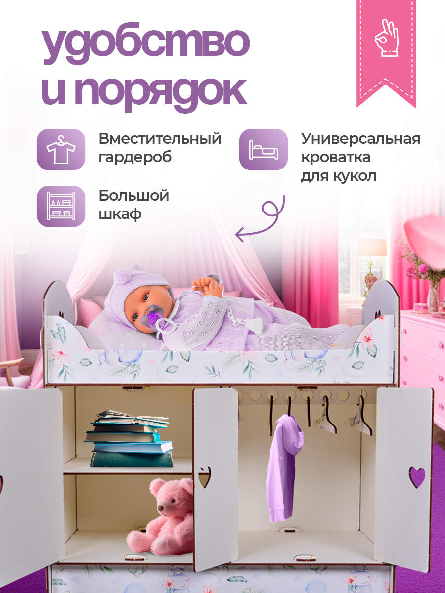 Кроватка со шкафом игрушечная детская для кукол деревянная Бегемотики / Постельное белье в подарок интересное: