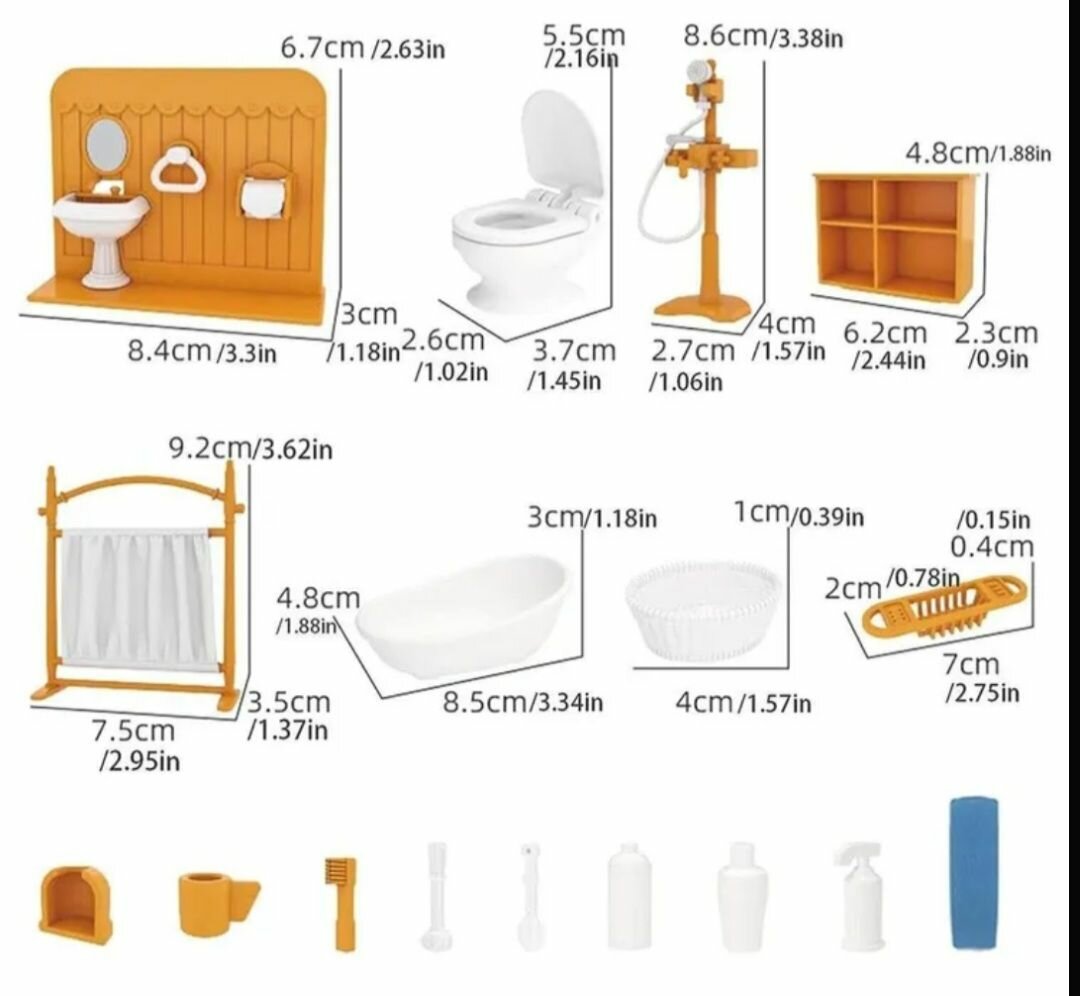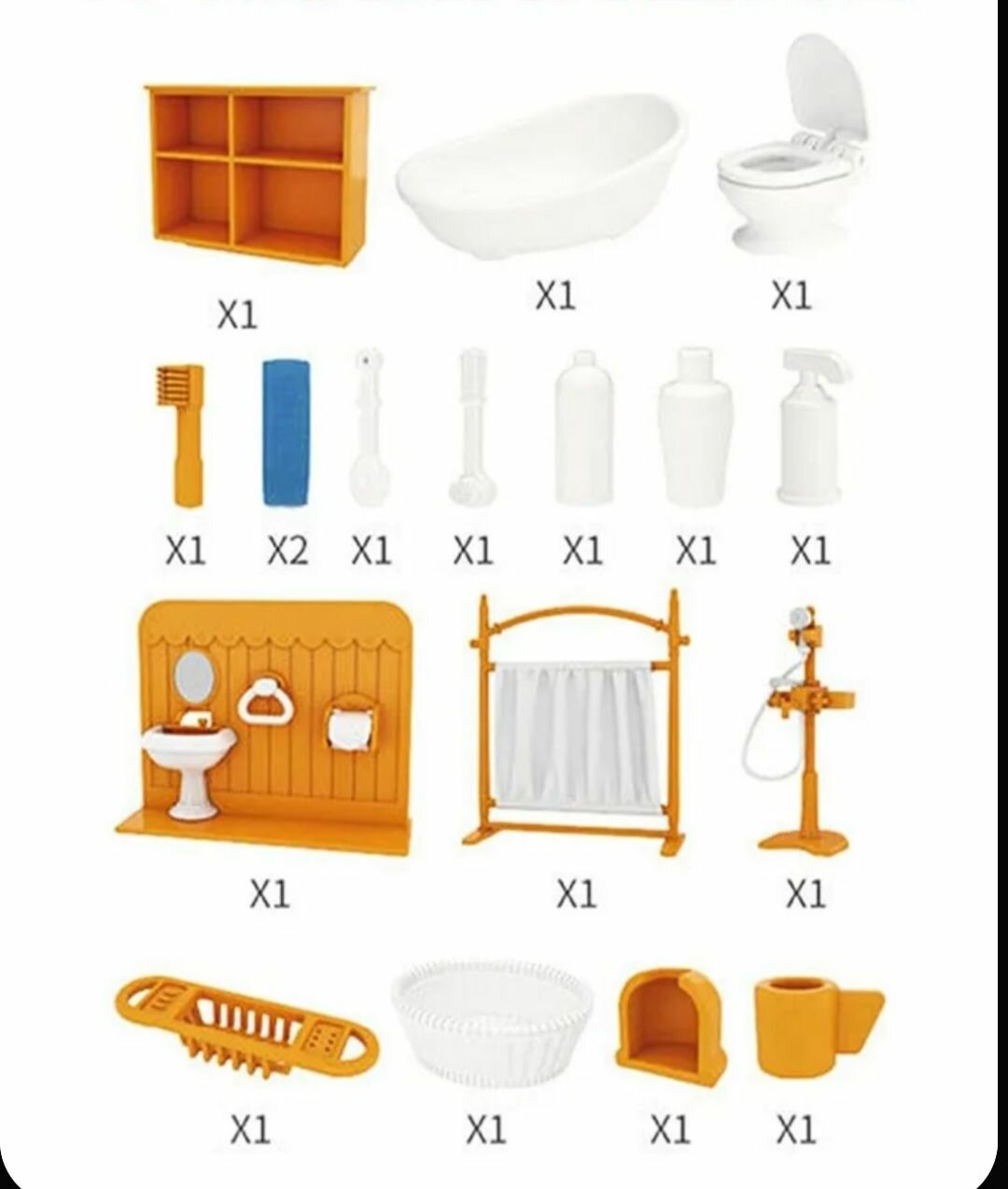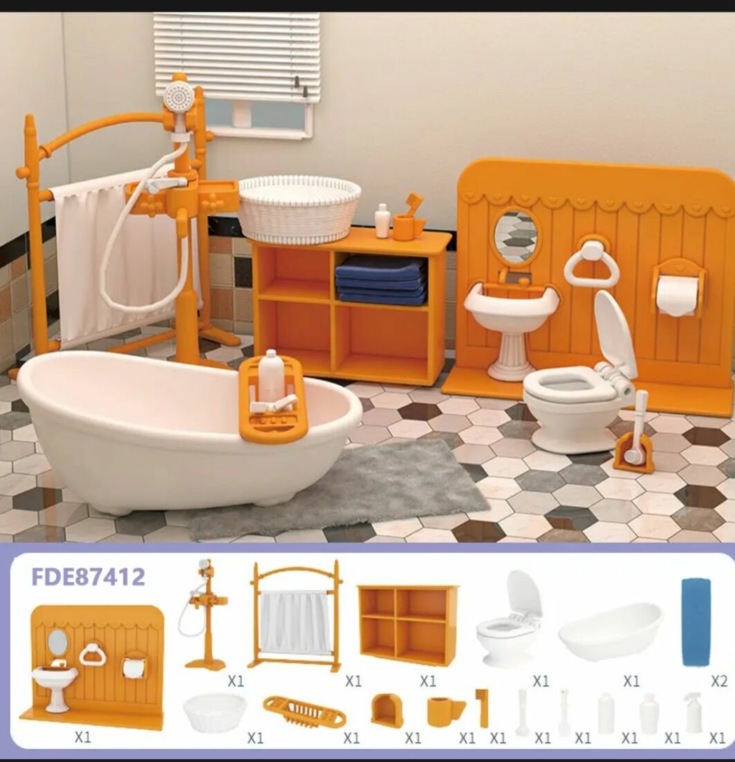 Кукольная мебель для домика , Набор из 4 комнат ( кухня , зал , комната спальня , ванная душ ) мебель для бархатных фигурок и кукол