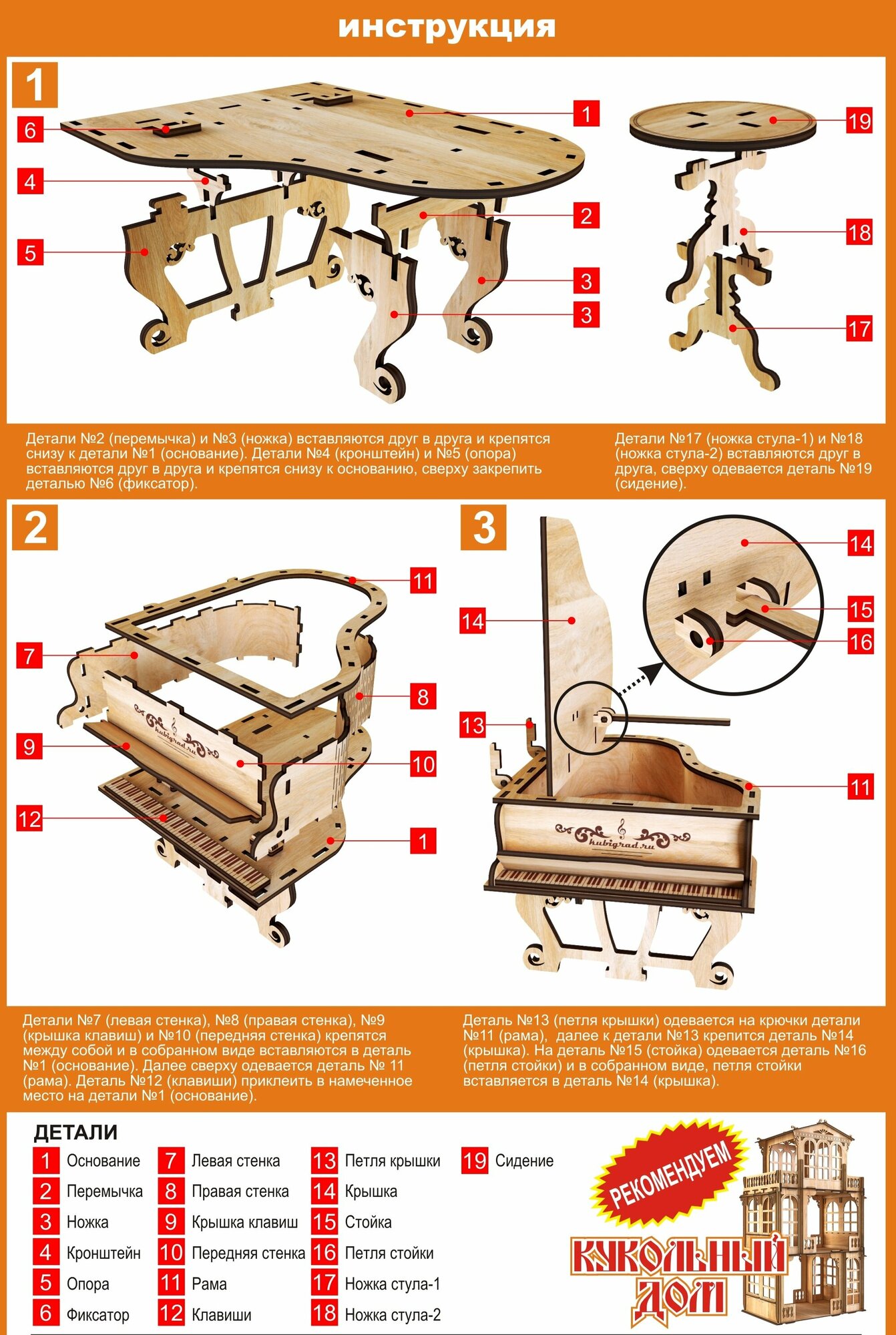 | Комплектация | В КОМПЛЕКТЕ: 24 детали для сборки рояля 22*18*14 см, стул 8*8*6 см |