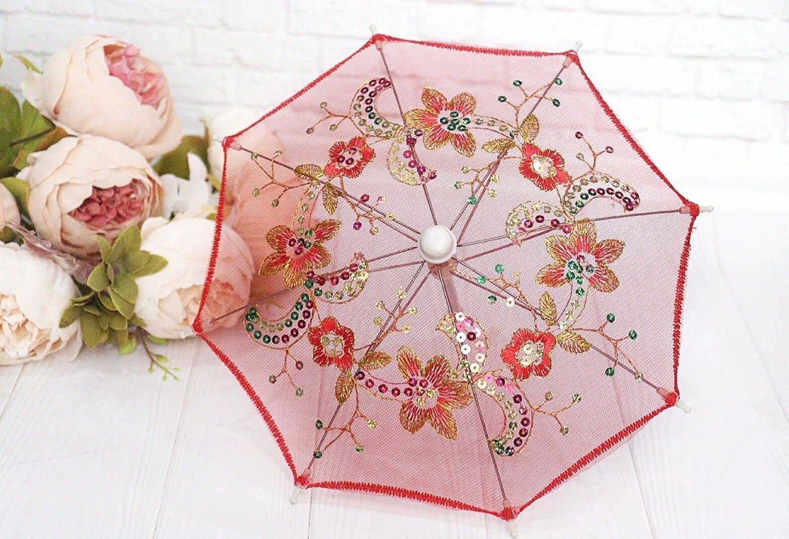 Купить Реалистичный зонтик с вышивкой и пайетками для кукол, длина 21 см, красный