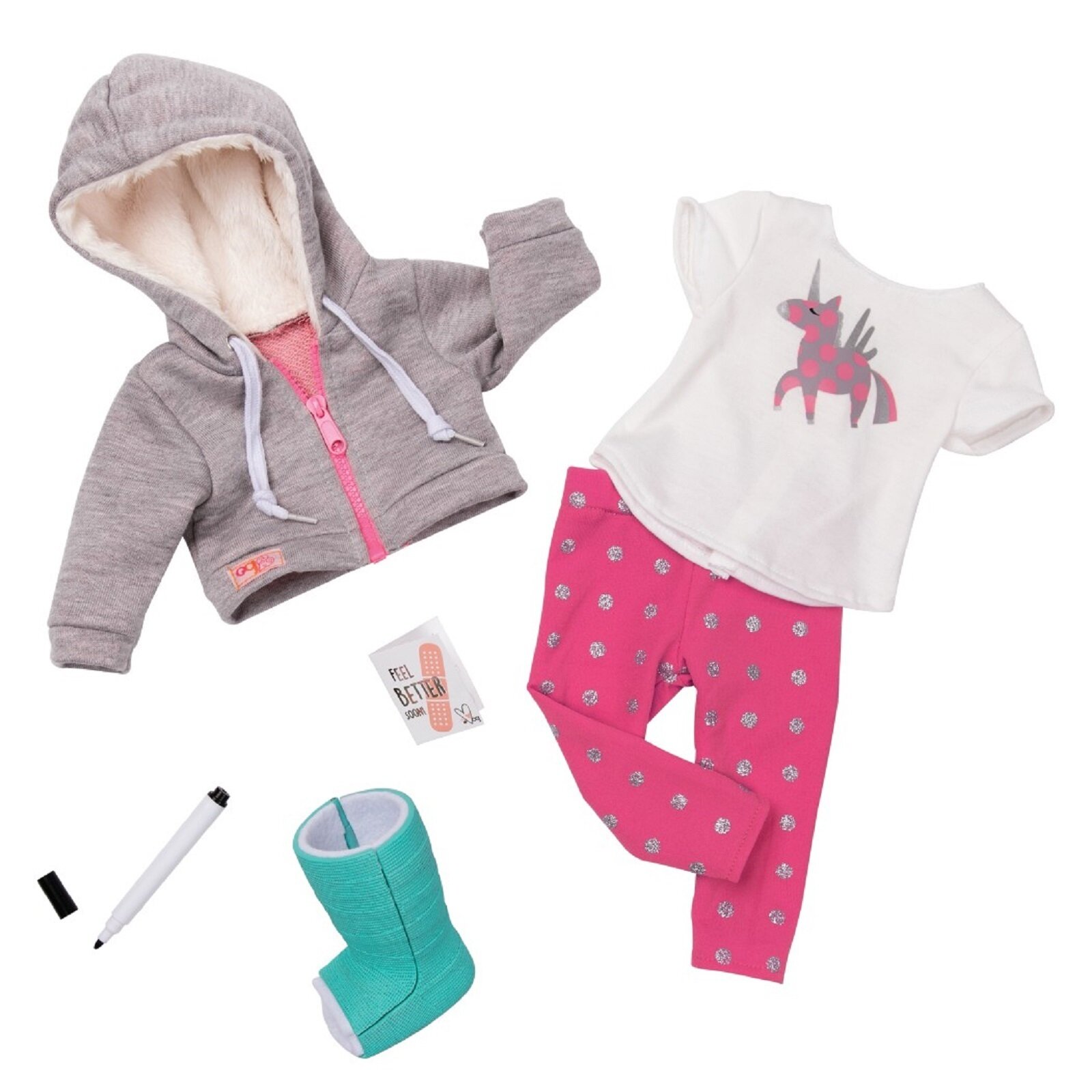 Одежда для кукол ДеЛюкс 46 см Our Generation Выздоравливай скорее с серым балахоном и бандажом для ноги интересное: