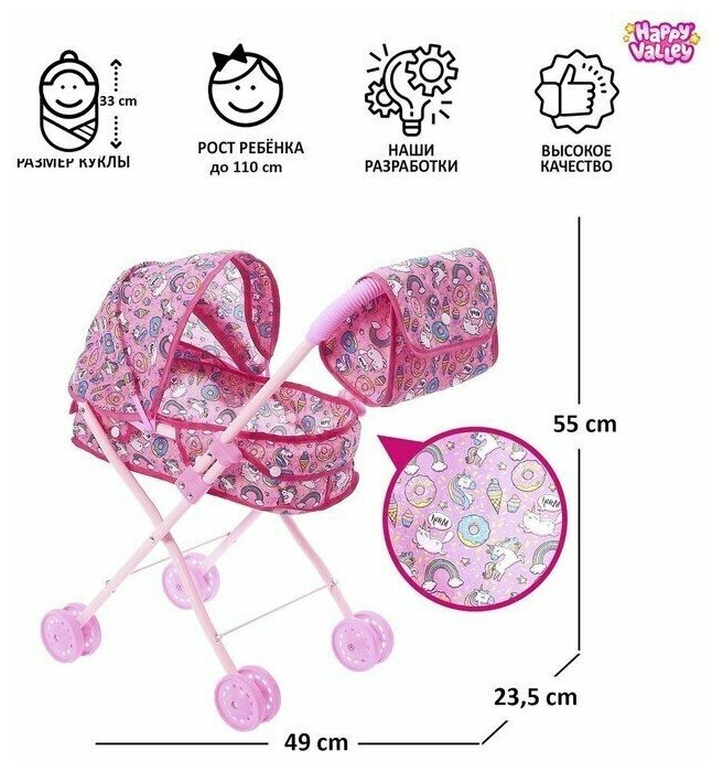 Купить Коляска для кукол с сумкой "Сладкая поняшка", универсальная, металлический каркас