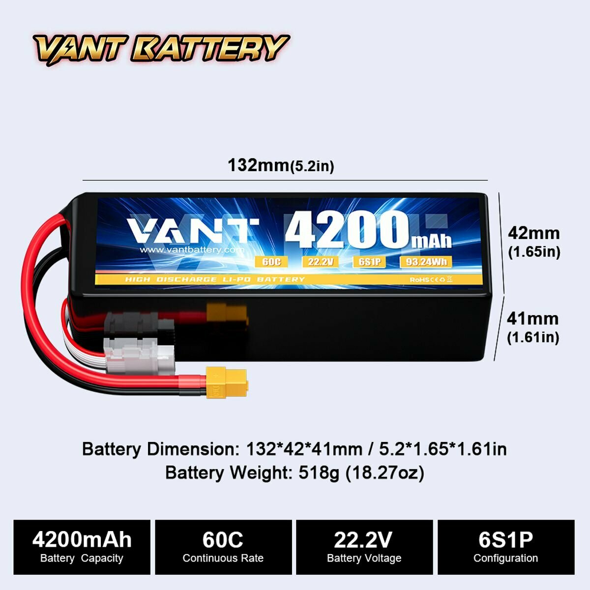 Аккумулятор LiPo Vant - 22.2В 4200мАч 60C (мягкий корпус, 6S, разъем XT60) интересное: