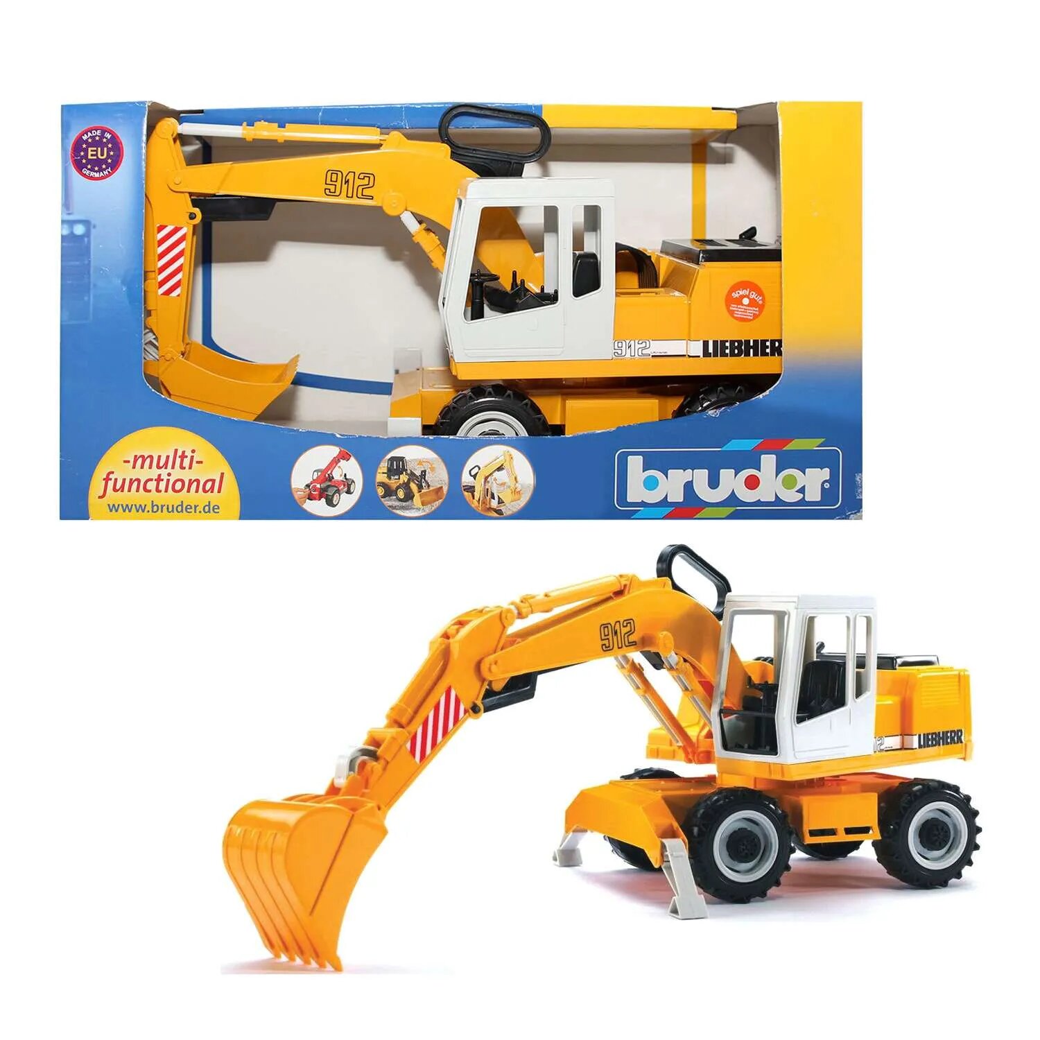 | Комплектация | подвижный ковш; платформа экскаватора поворачивается на 360 °; шины с протекторами; стальная ось; совместим со всеми игрушками и фигурками брудер; сделан на основе реальной модели либхер; имеются опоры для устойчивого положения |