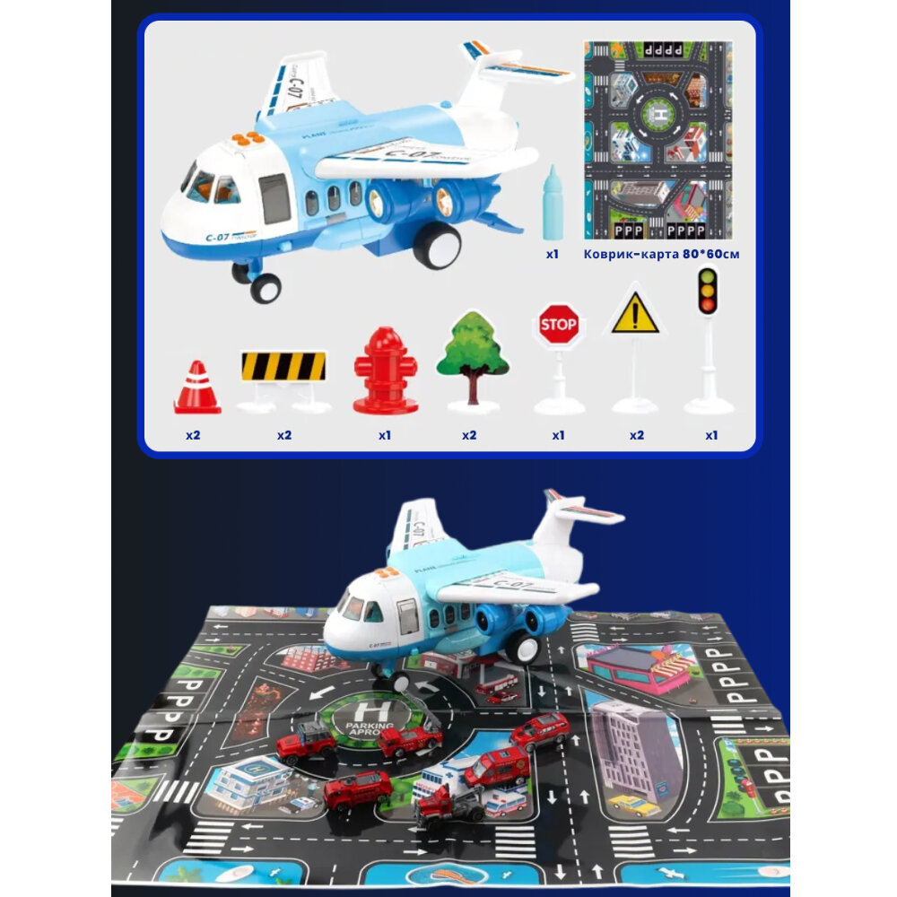 Большой инерционный самолет 39 х 38 х 19 см с паром, в комплекте 6 машин, дорожные знаки, свет, звук интересное: