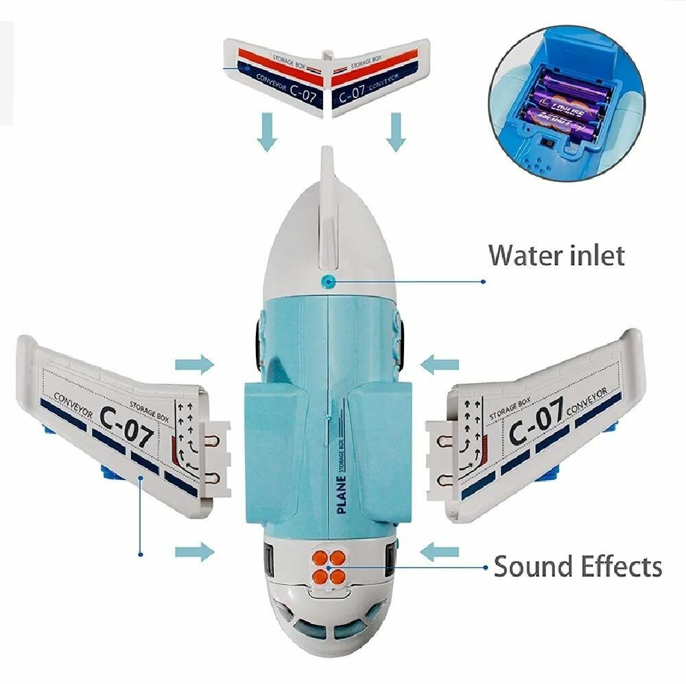 | Комплектация | - игрушка самолет 39 х 38 х 19 см со съемными крыльями; -бутылочка для воды; -пленка карта с рисунком дороги 79 х 60 см; -6 машинок 7 х 3 х 3,5 см; -8 дорожных знаков от 4 до 10 см; -2 фигурки деревьев 5 х 3.5 х 7 см. |