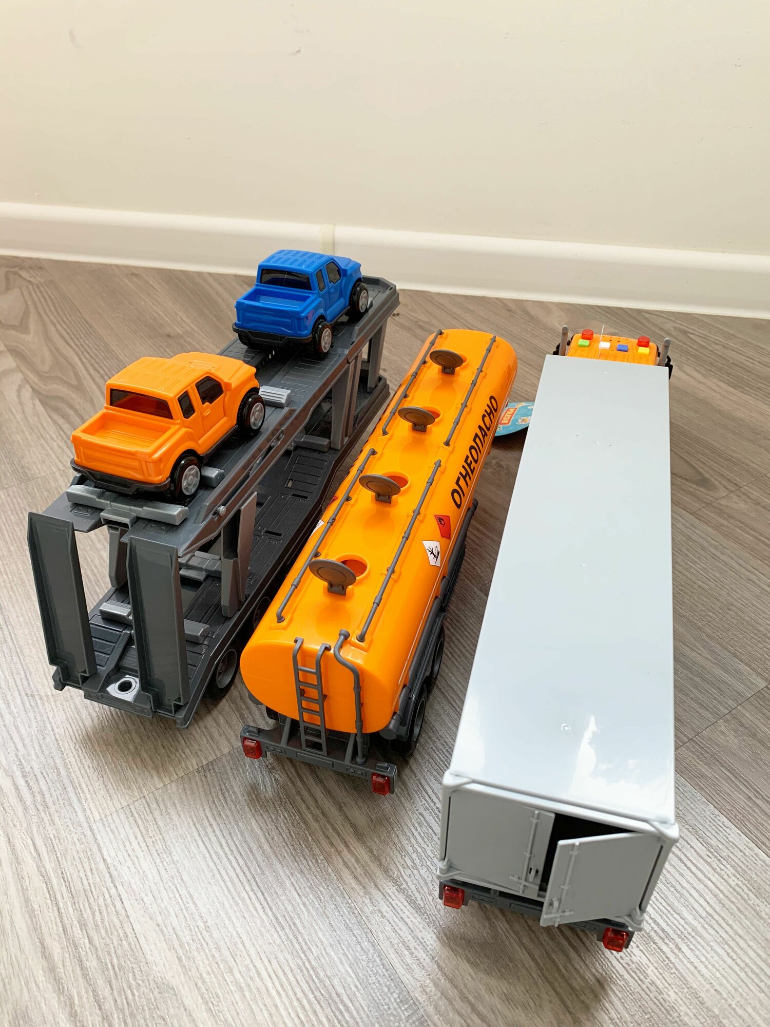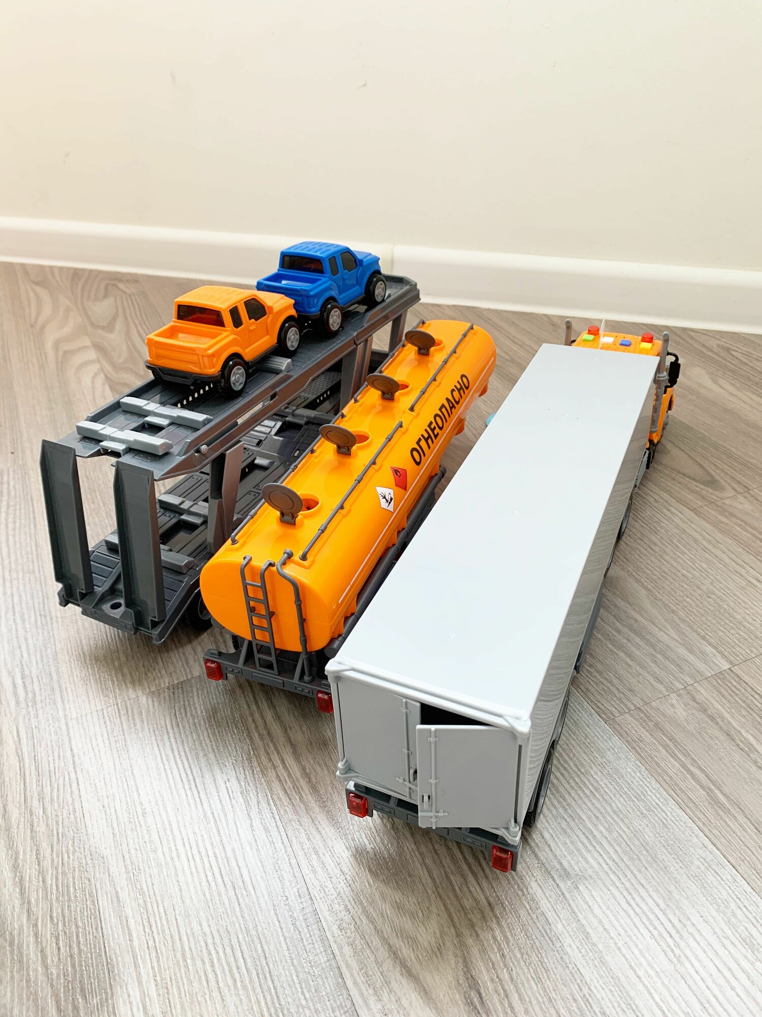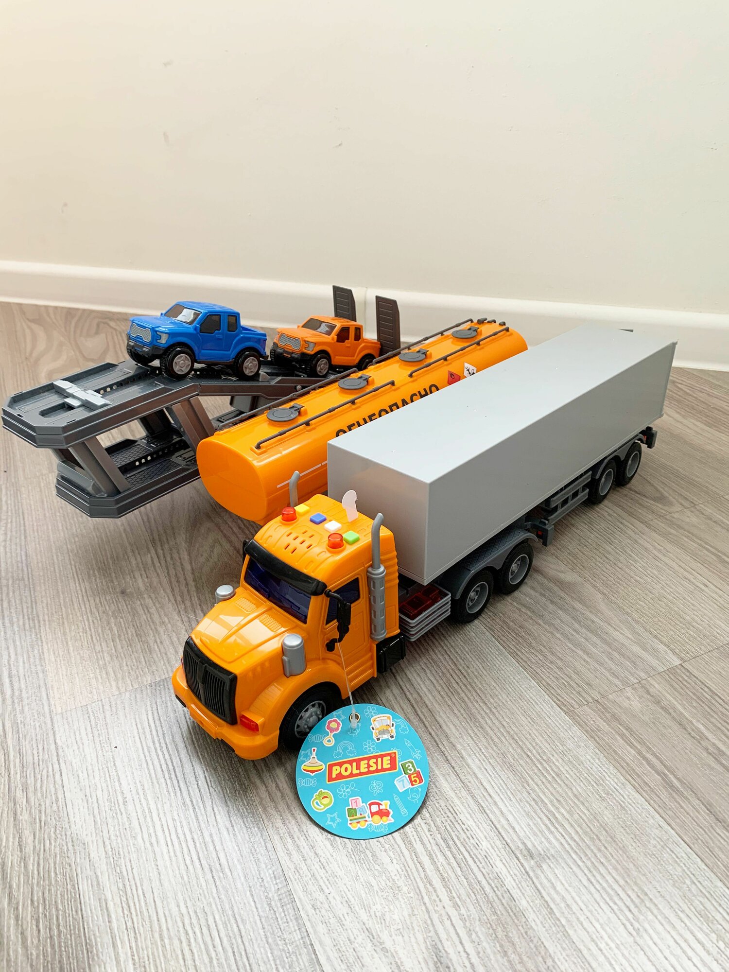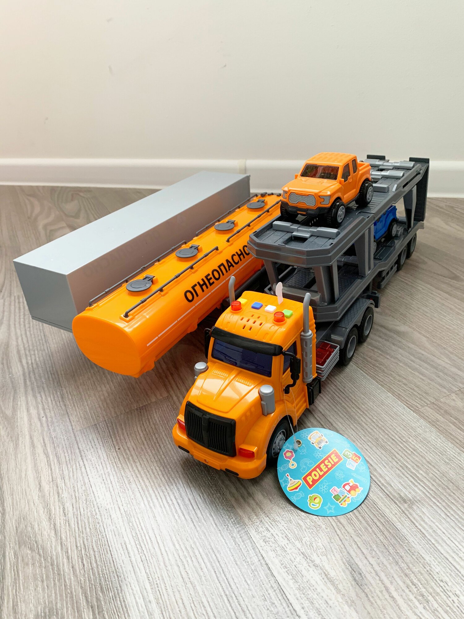 Набор 3 прицепа (фура, бензовоз, автовоз с 2-мя машинками) и тягач (динамо-инерция, свет, 4 звука) Профи Полесье оранжевый интересное: