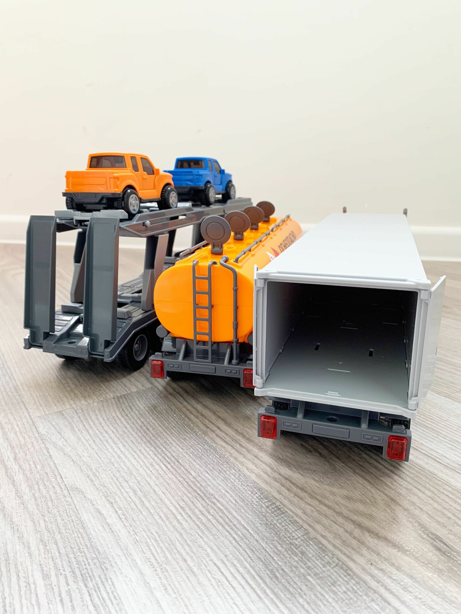 Купить Набор 3 прицепа (фура, бензовоз, автовоз с 2-мя машинками) и тягач (динамо-инерция, свет, 4 звука) Профи Полесье оранжевый