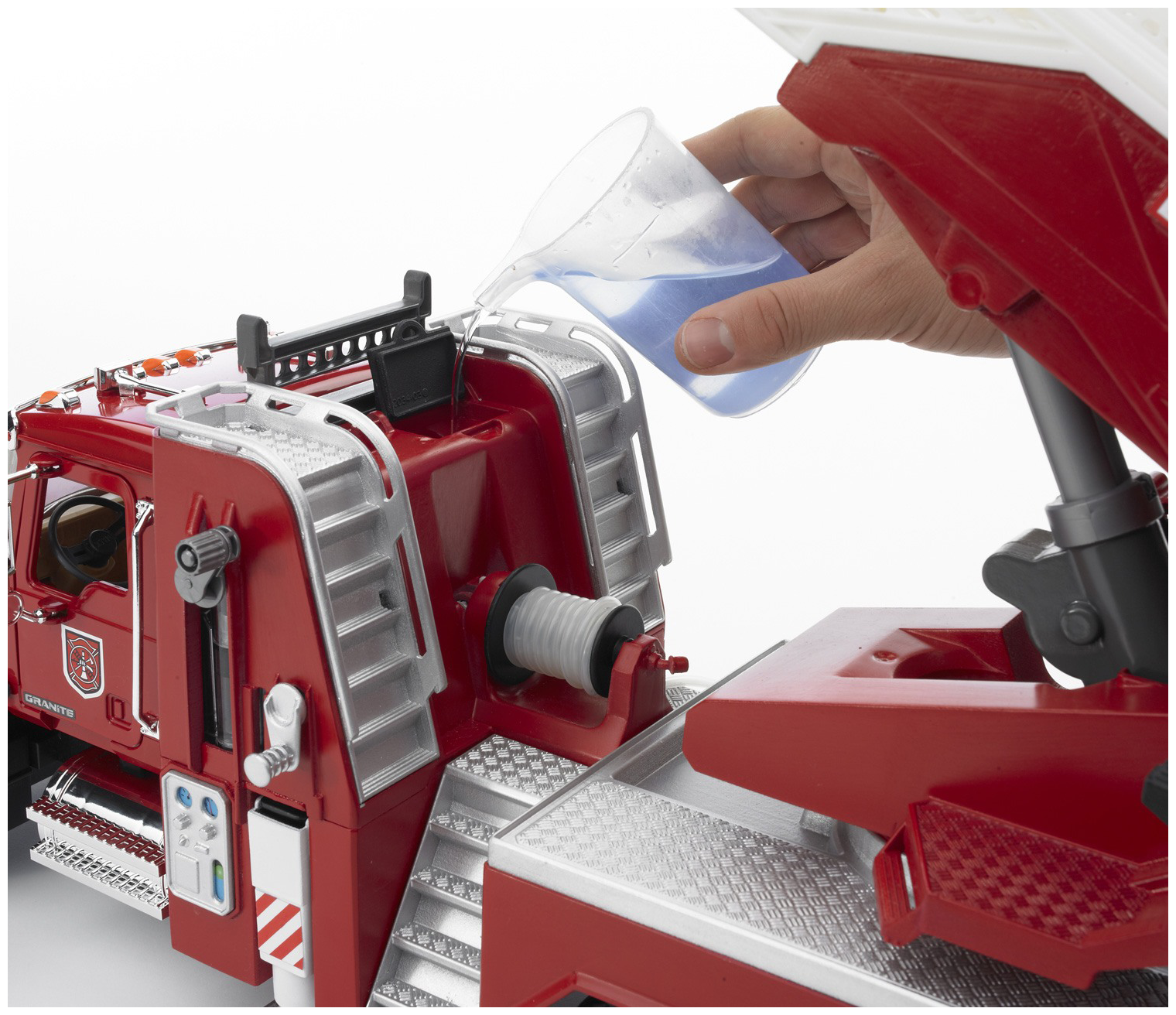 | Особенности | батарейки в комплекте / коллекционная / открывается капот/багажник / открываются дверцы / выдвижная стрела с лестницей / можно заливать воду / работающий насос со шлангом / складные зеркала |