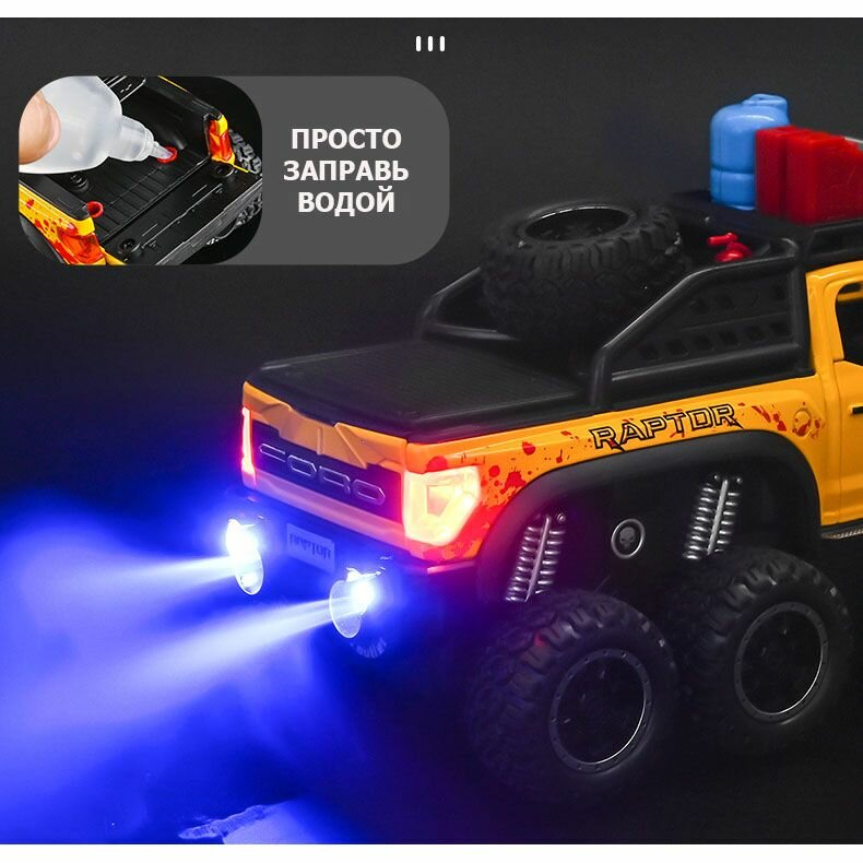 СохранитьМашинка Форд Раптор с дымом. Металлическая модель автомобиля Ford Raptor внедорожник 6х6 красный 21см. Инерционная игрушка машина 1:24 интересное: