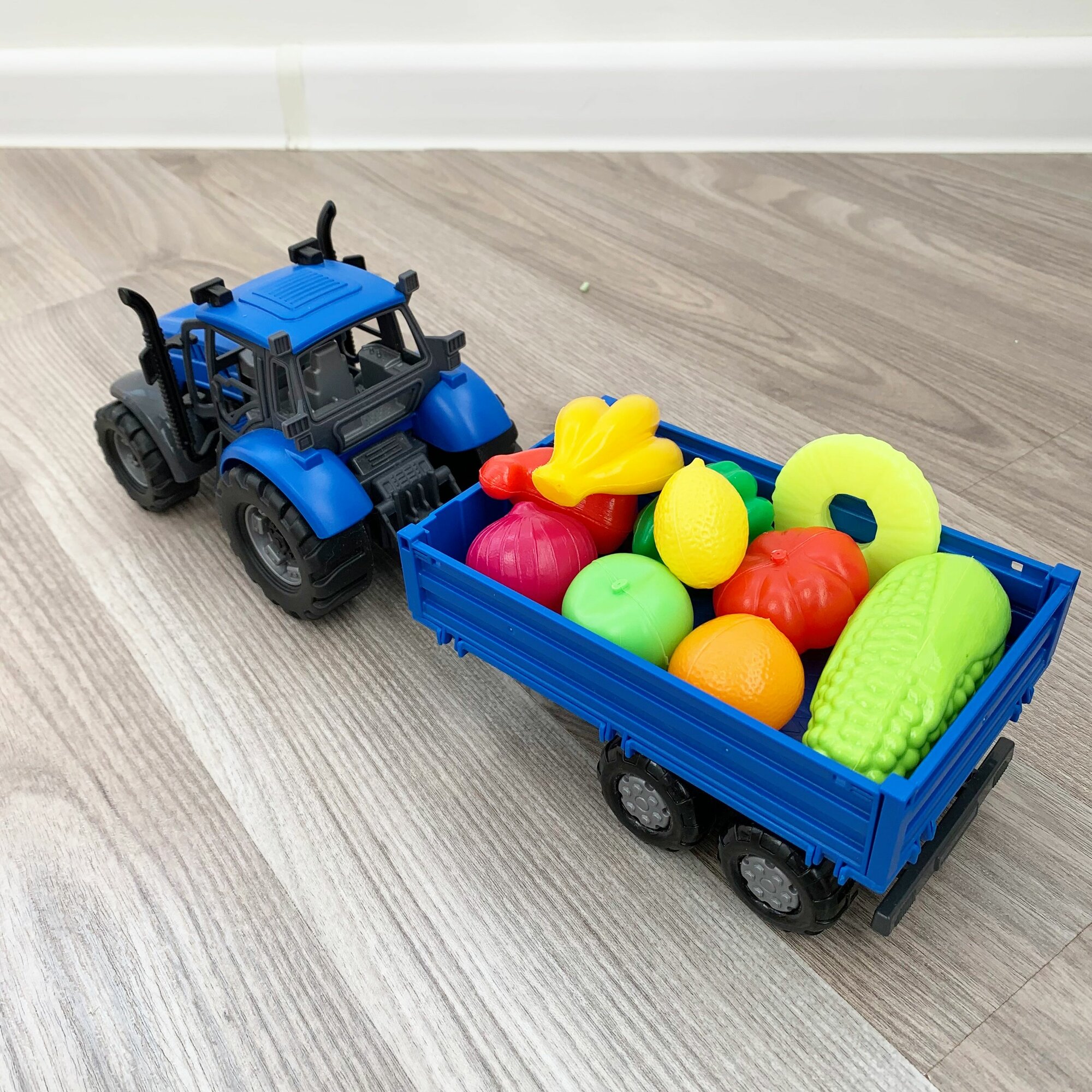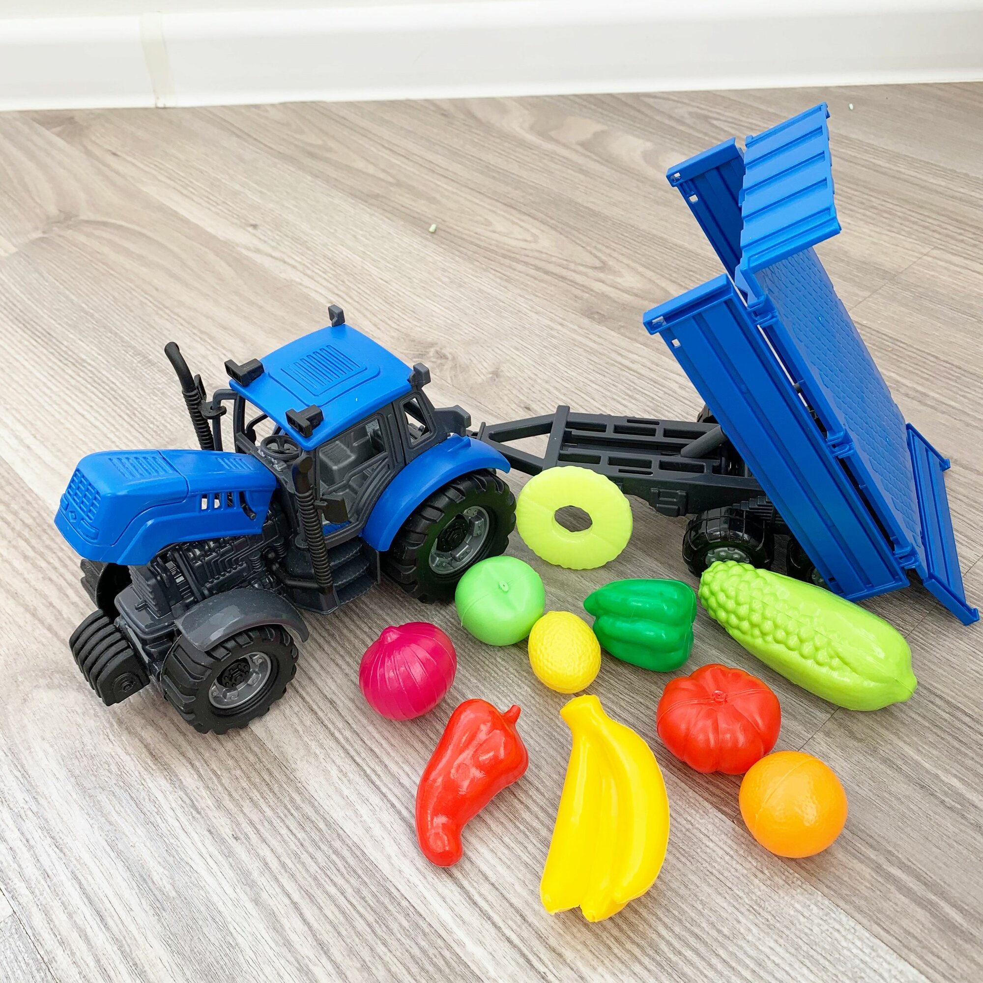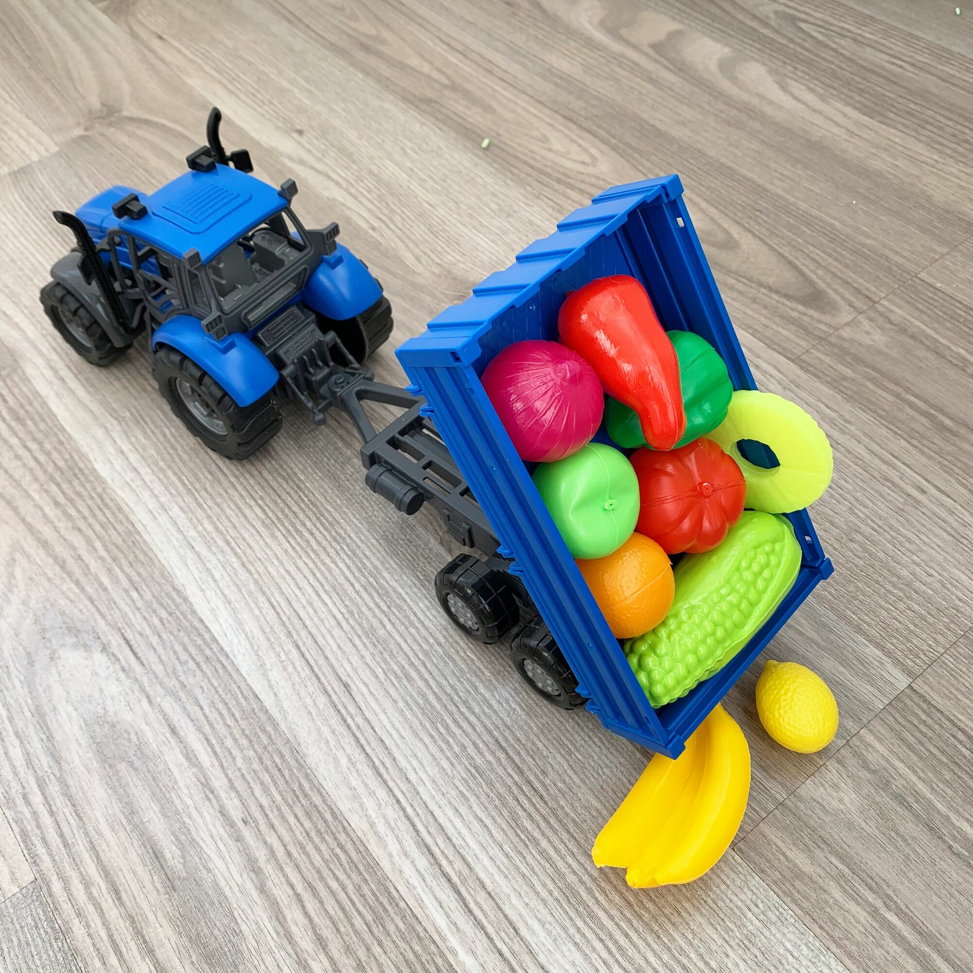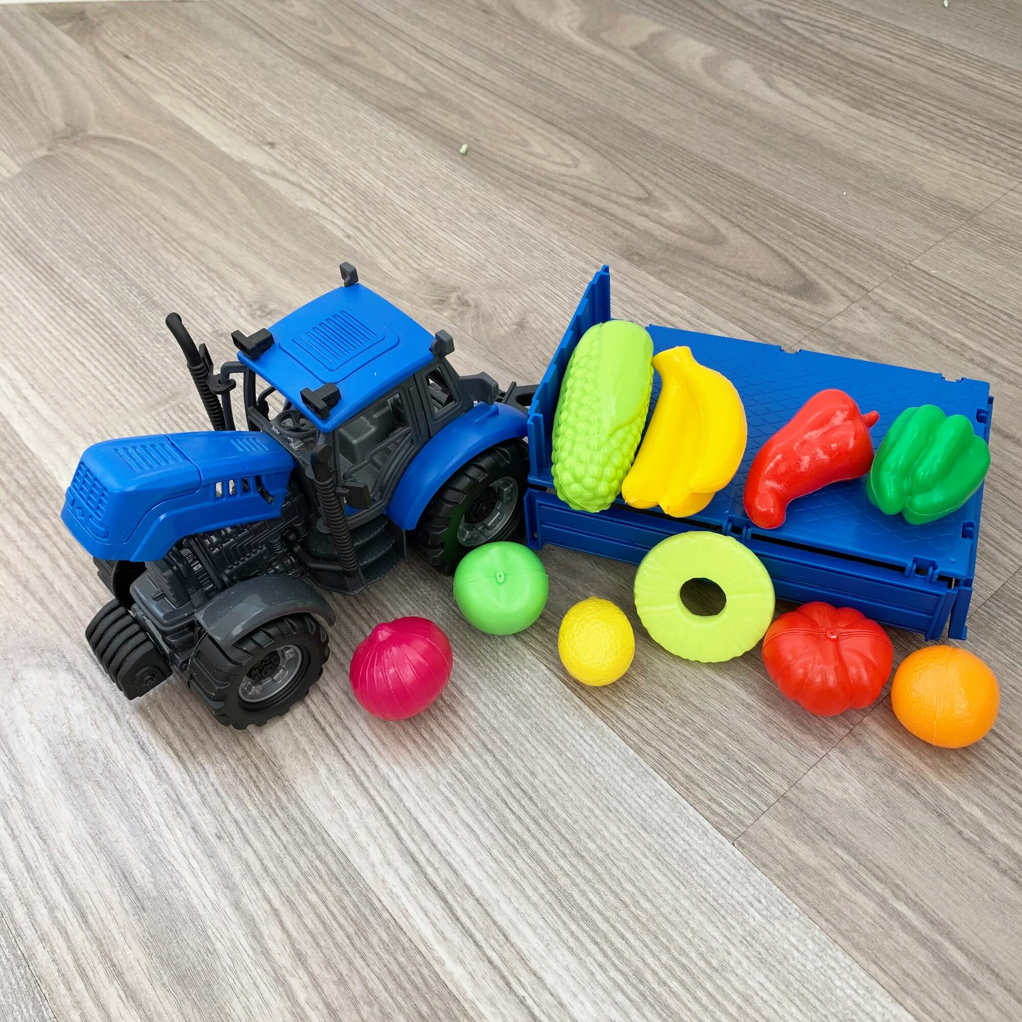 Инерционный трактор с бортовым прицепом и 10-ю мини овощами и фруктами / Полесье интересное: