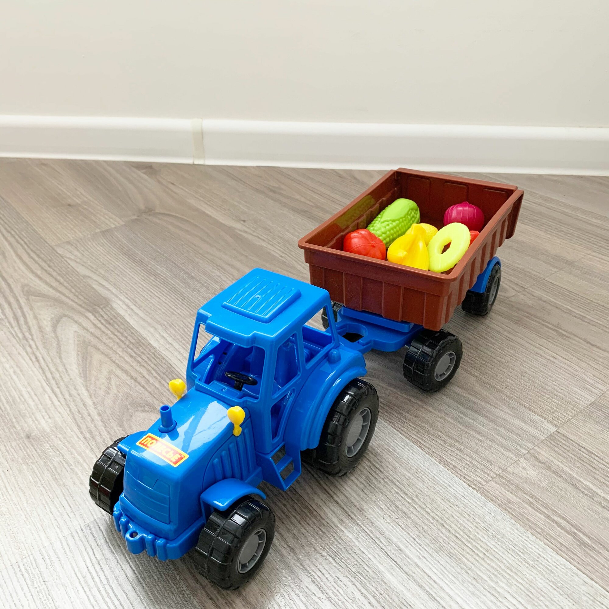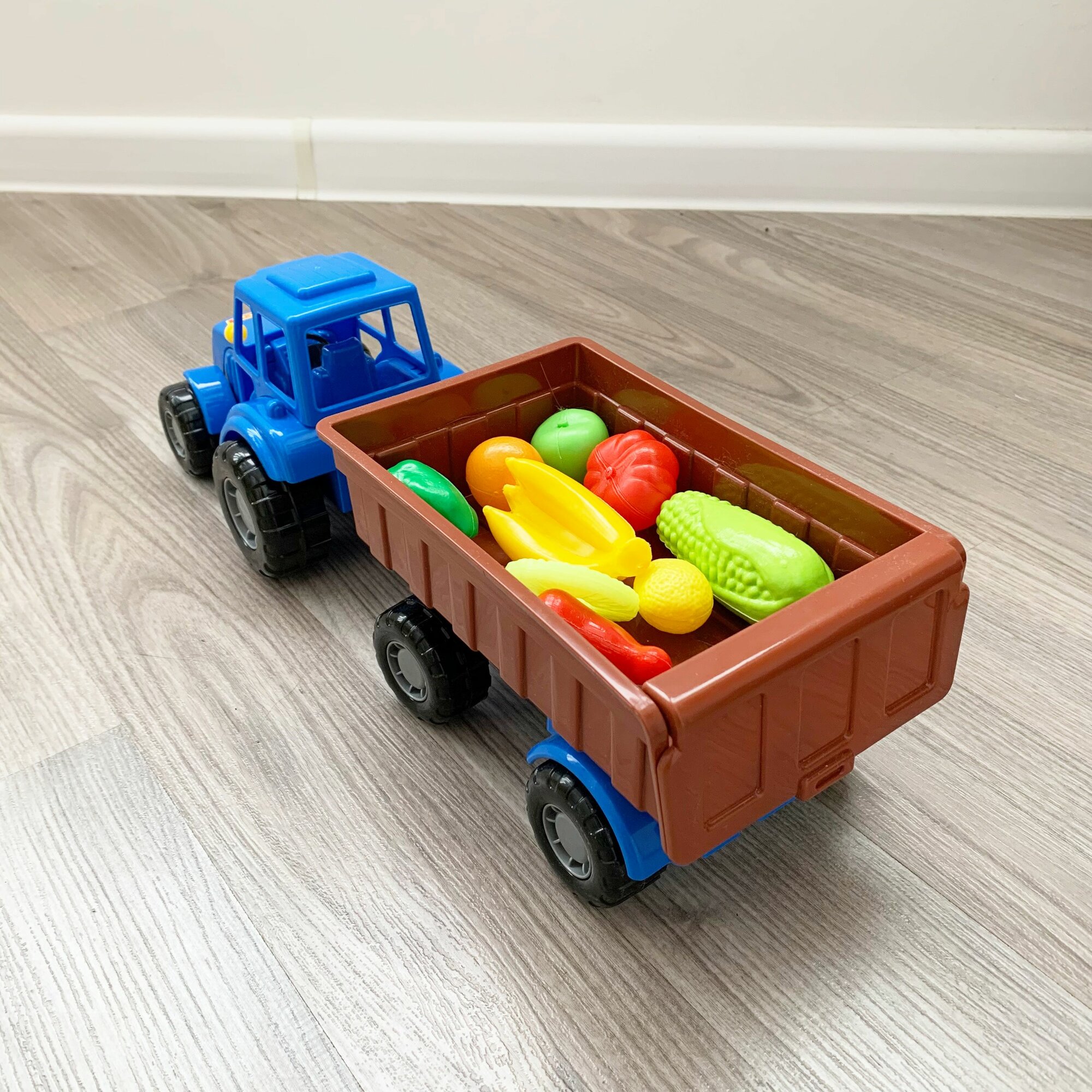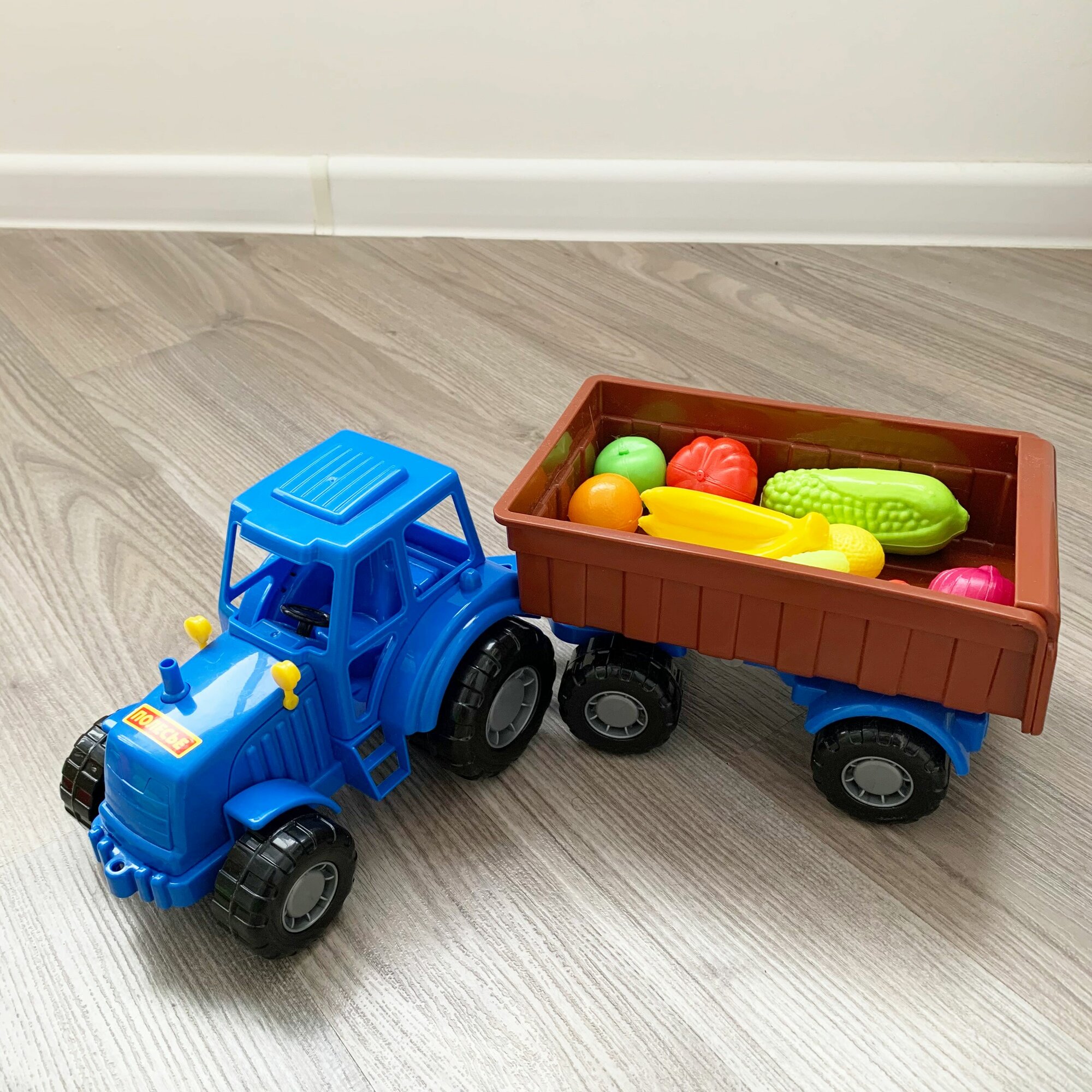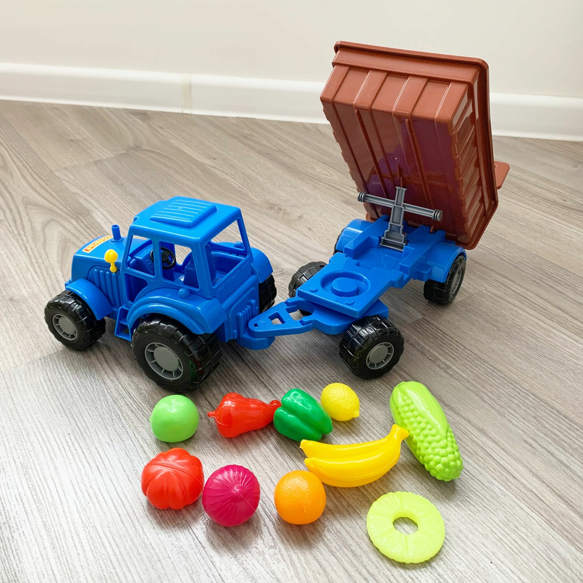 Развивающий игровой набор: 10 шт. мини овощей и фруктов + синий трактор 44,7 см с кузовным прицепом / Полесье интересное: