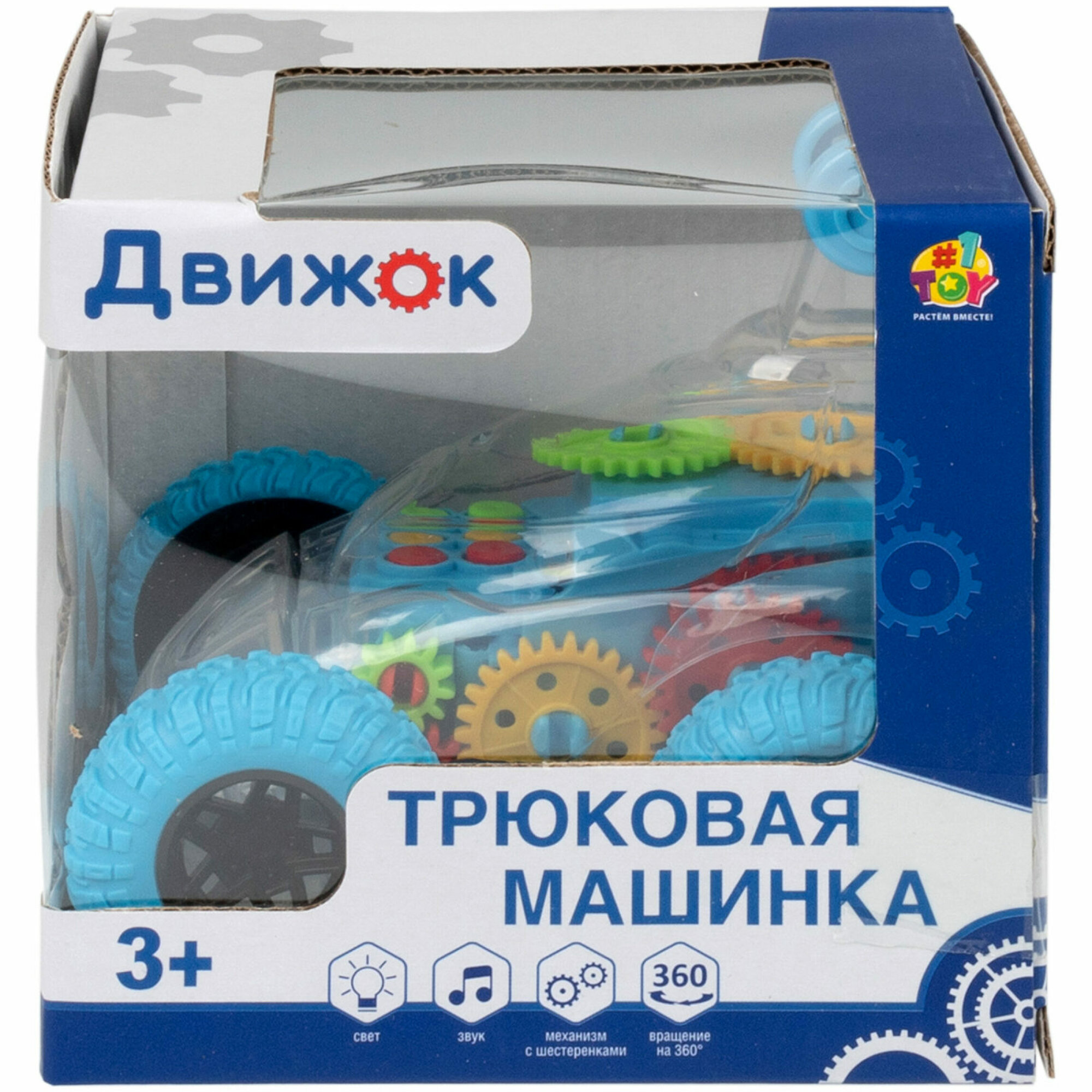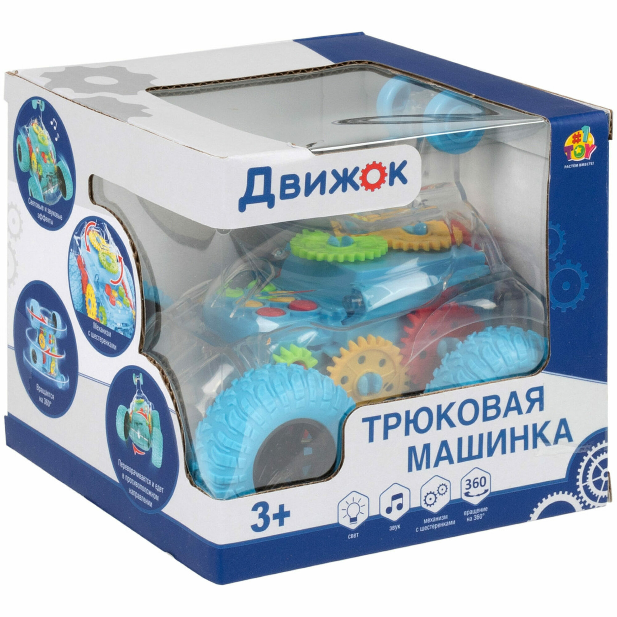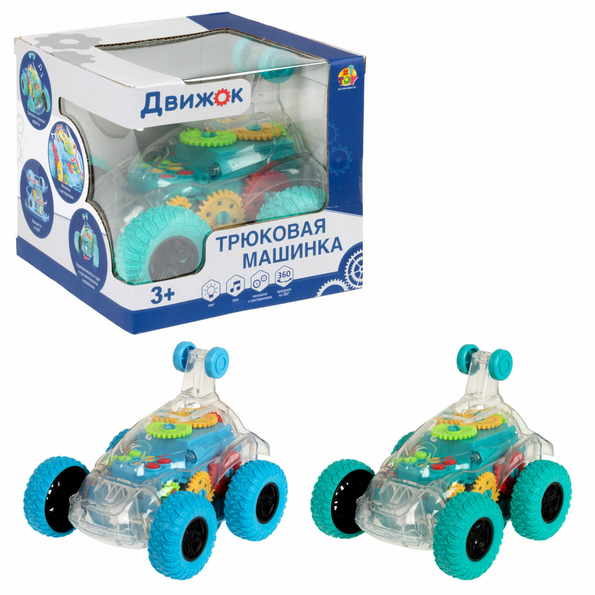 Купить Машинка 1TOY Движок, трюковая, прозрачная с шестеренками, со светом и звуком, 1 шт.