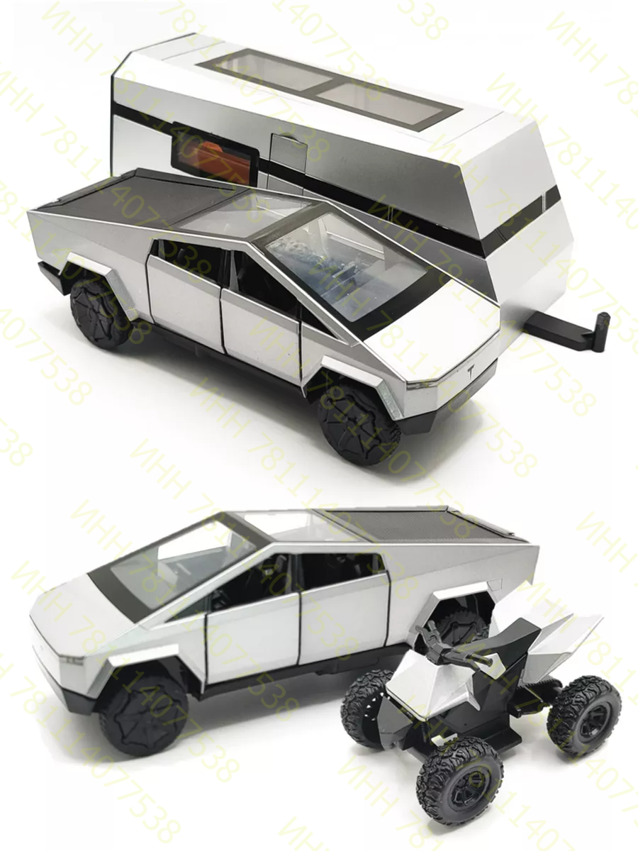 Машинка-кемпинг с квадроциклом Тесла Кибертрак 23 см металлическая инерционная, со световыми и звуковыми эффектами, серебро