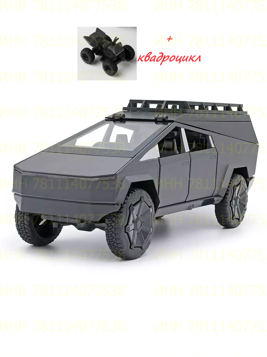 Машинка с квадроциклом Тесла Кибертрак 23 см металл инерция, открываются двери, капот, багажник, поворотные передние колеса, свет и звук, темно-серый