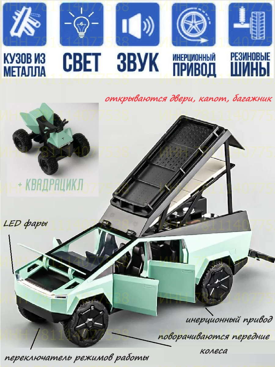 Машинка с квадроциклом Тесла Кибертрак 23 см металл инерция, открываются двери, капот, багажник, поворотные передние колеса, свет и звук, зеленый
