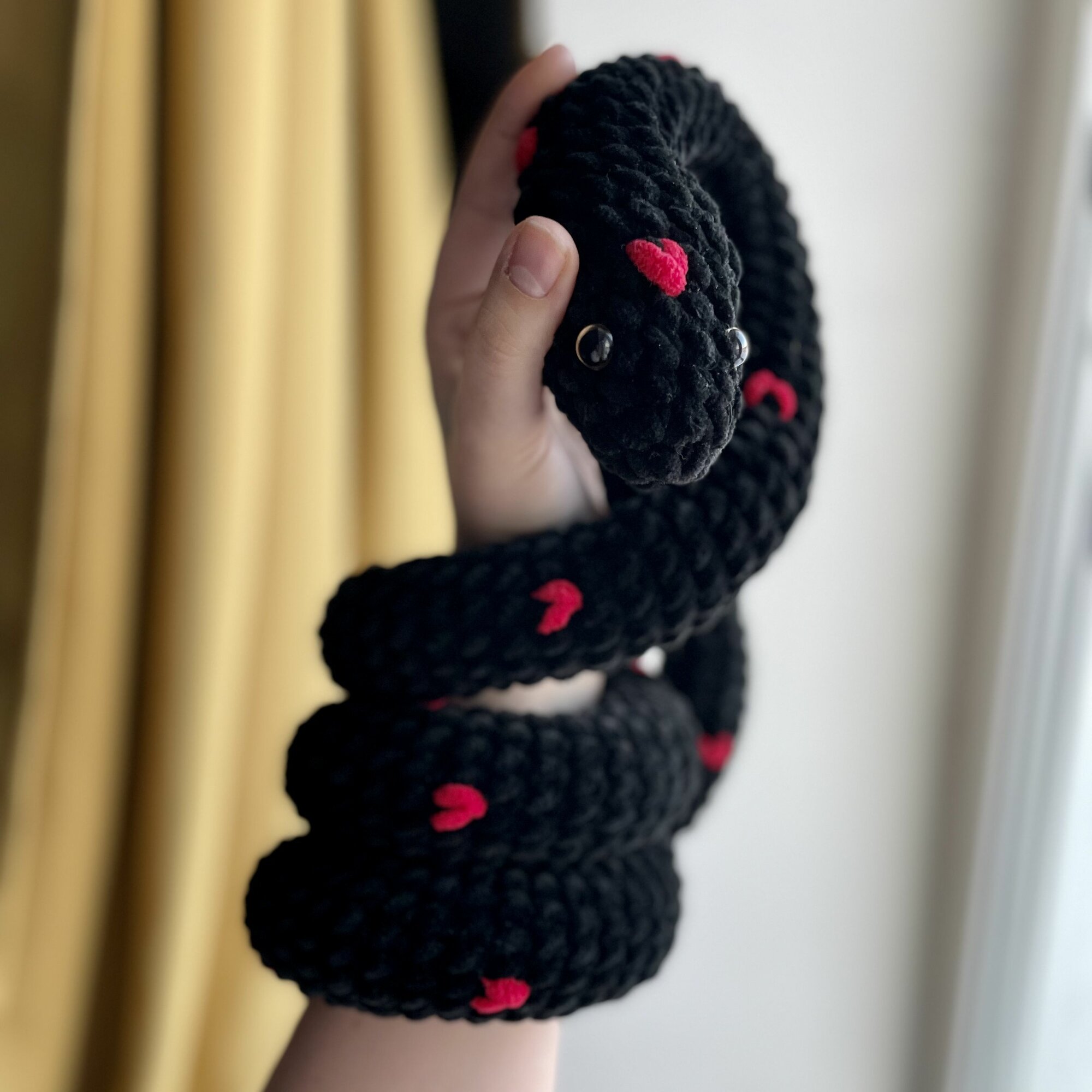 Вязаная мягкая игрушка "Змея" / змейка с сердечками / черный 150 см